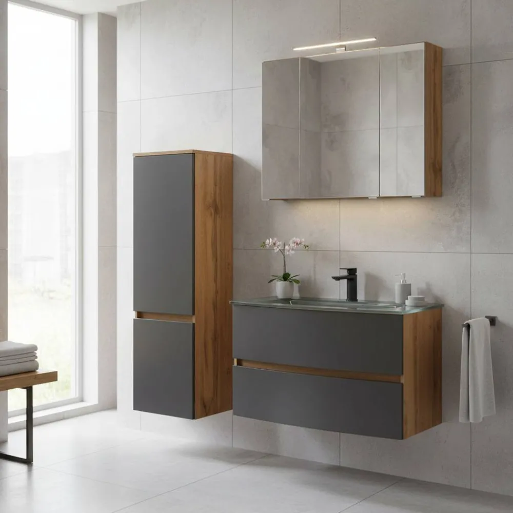 - Trendstarkes Badmöbel Set in Grau und Wildeichefarben