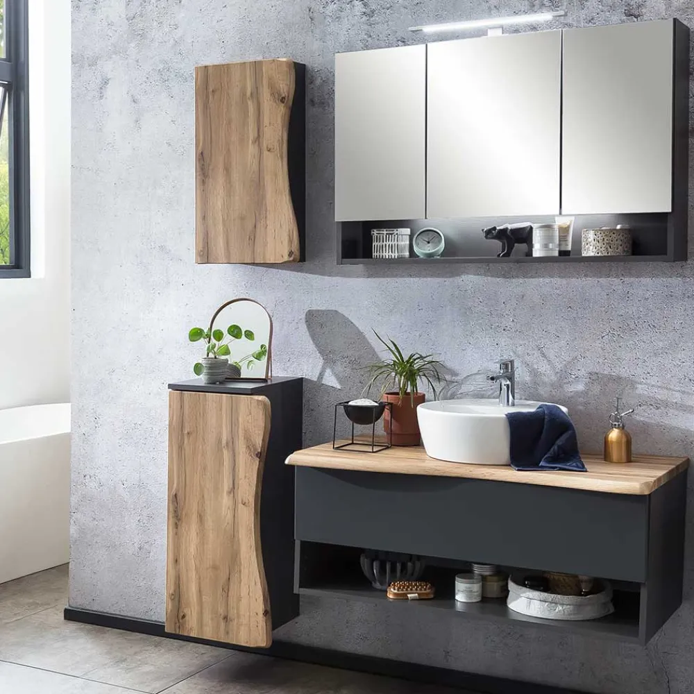 - Badmöbel Ensemble in Dunkelgrau und Wildeichefarben mit Baumkantenoptik