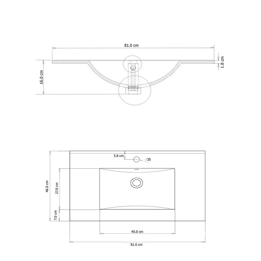 - Maße Waschbecken: BxHxT: 81×1,6×46 cm