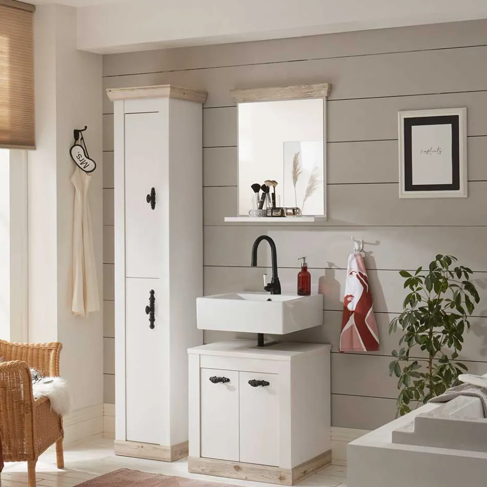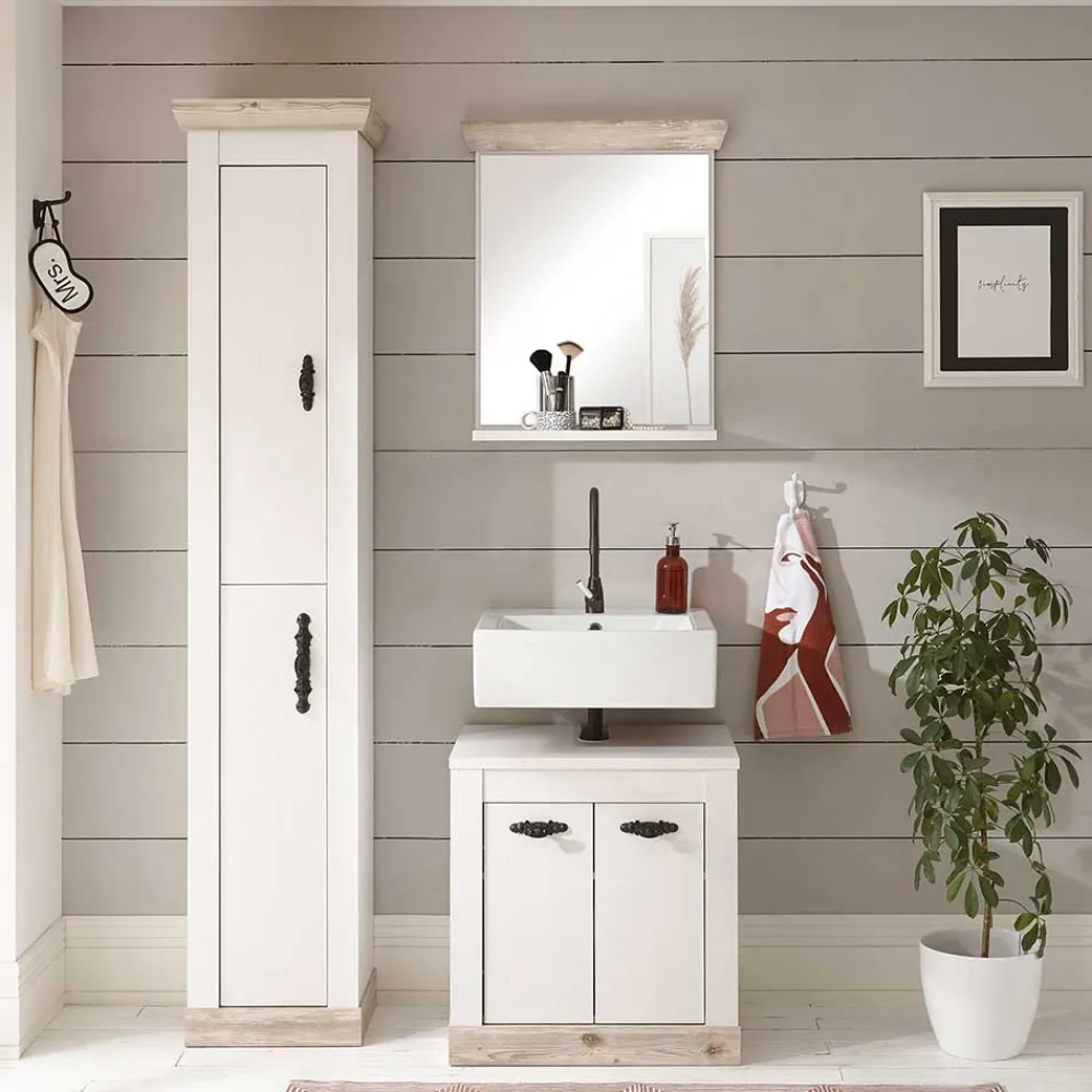 - Wohnliche Badkombination in Weiß und Pinienfarben