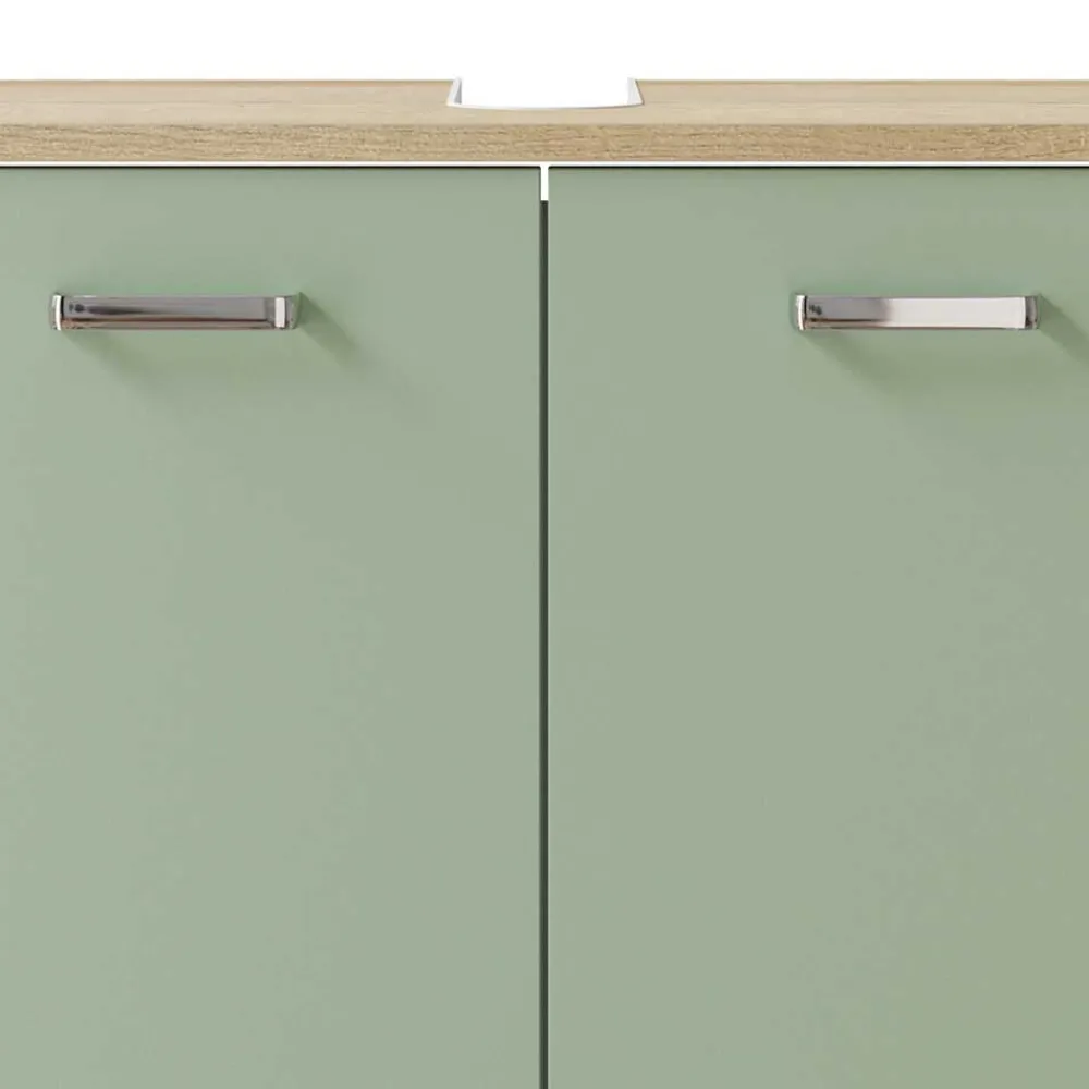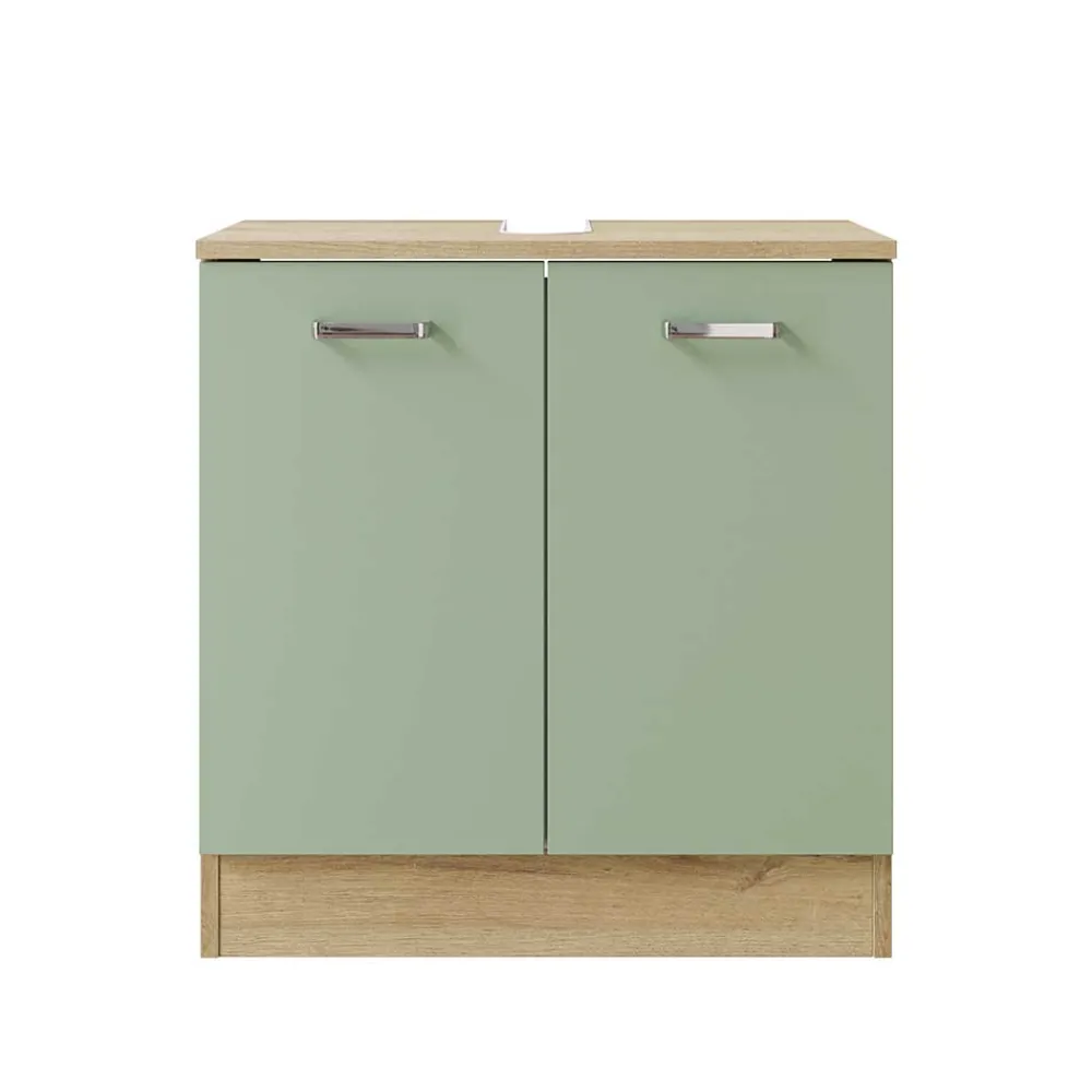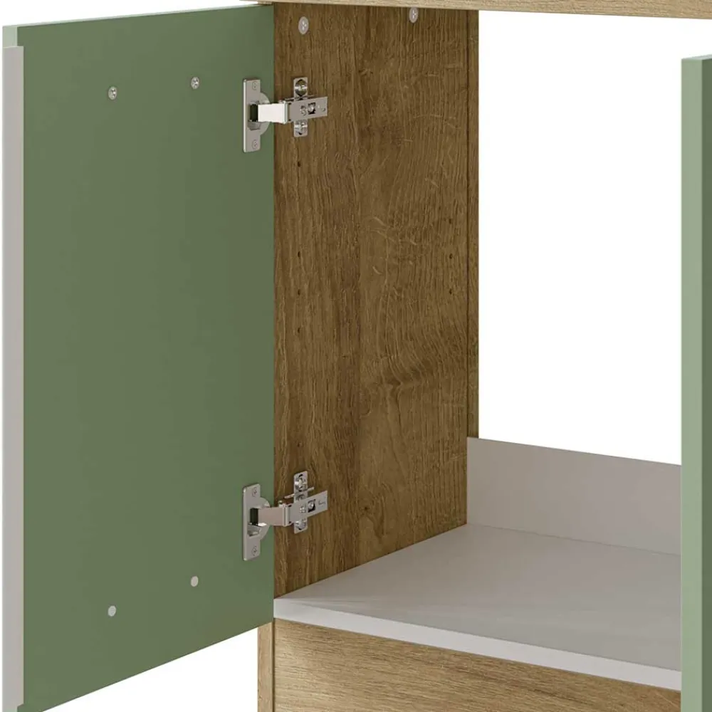 - Trendstarker Waschbeckenunterschrank in Graugrün und Eichefarben