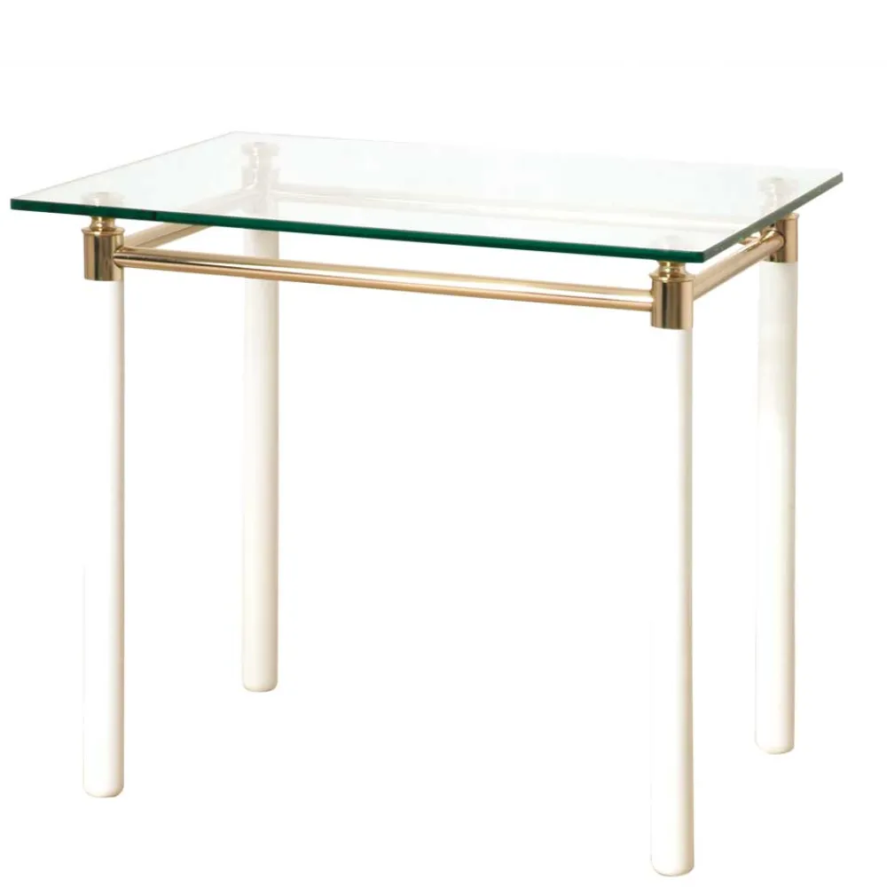 - Tischplatte aus 10 mm starkem Sicherheitsglas, Gestell aus lackiertem Massivholz