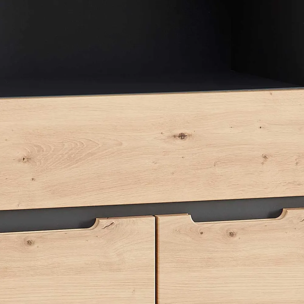 - Pflegeleicht folierte Oberflächen in Holzoptik Wildeiche und Dunkelgrau, Front mit tiefgezogenen Kanten