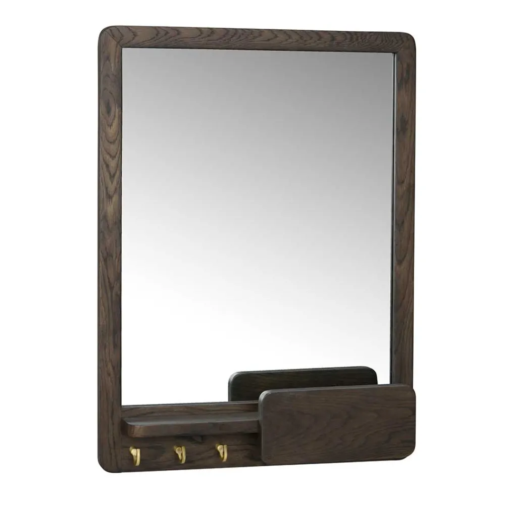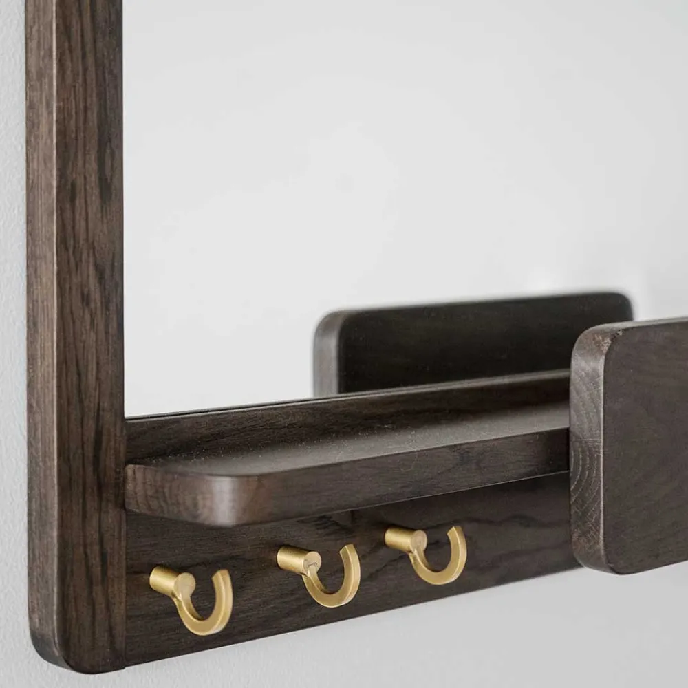 - Dekorativer Holzrahmen mit einer praktischen Ablage und drei Metallhaken in Messingfarben gebürstet