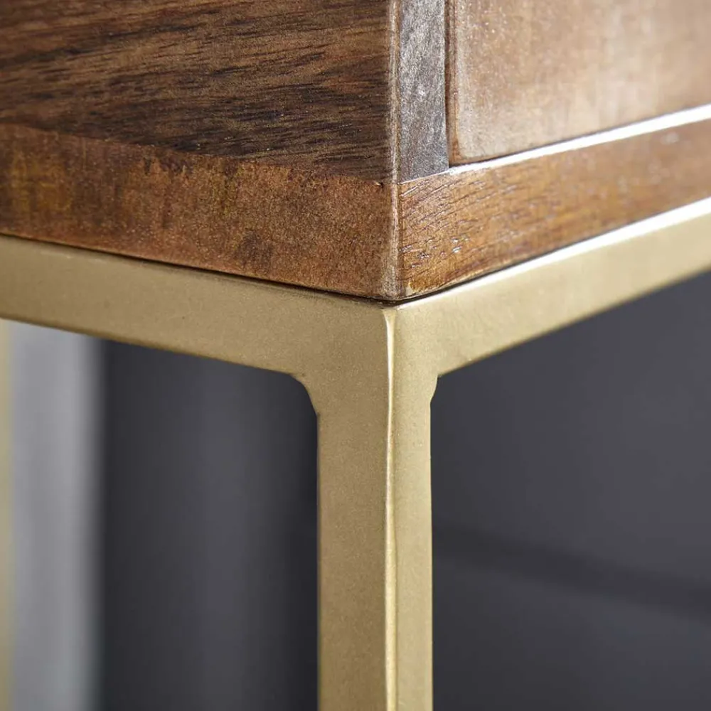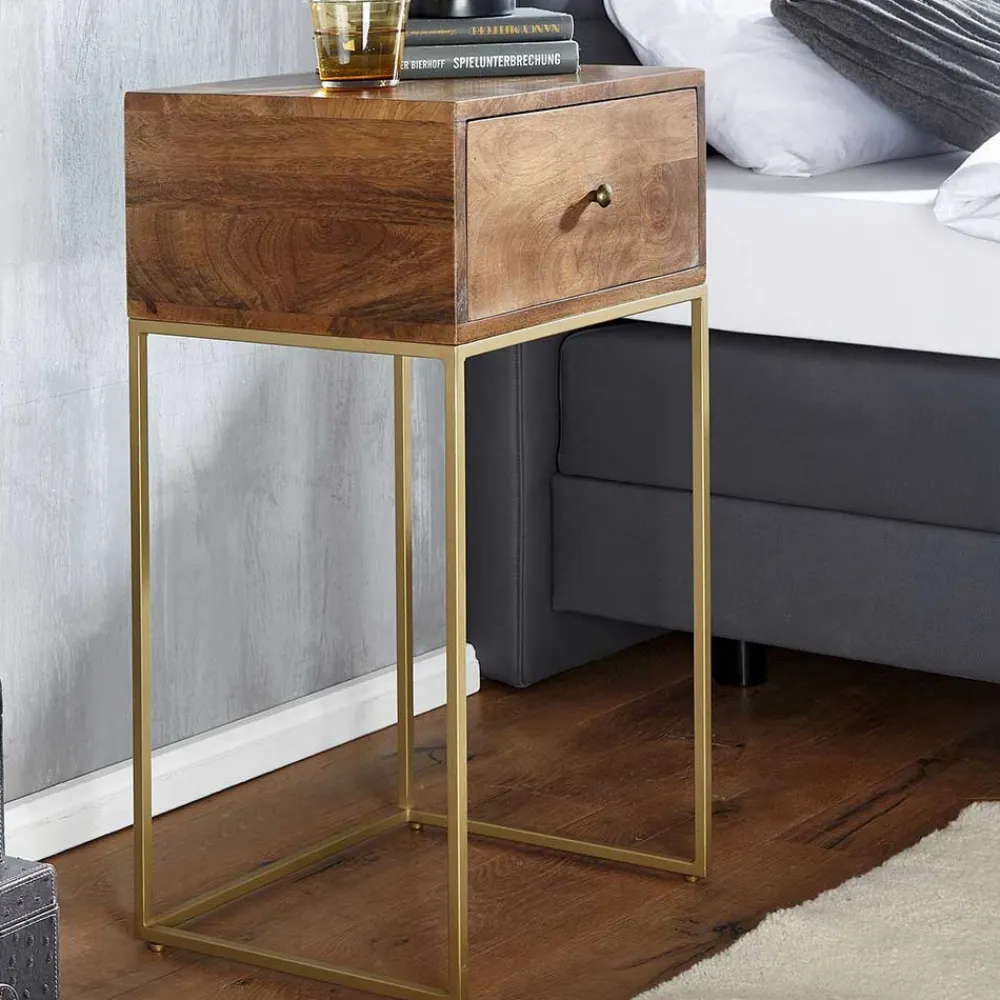 - Hohe Nachtkommode in Mangoholz und Goldfarben