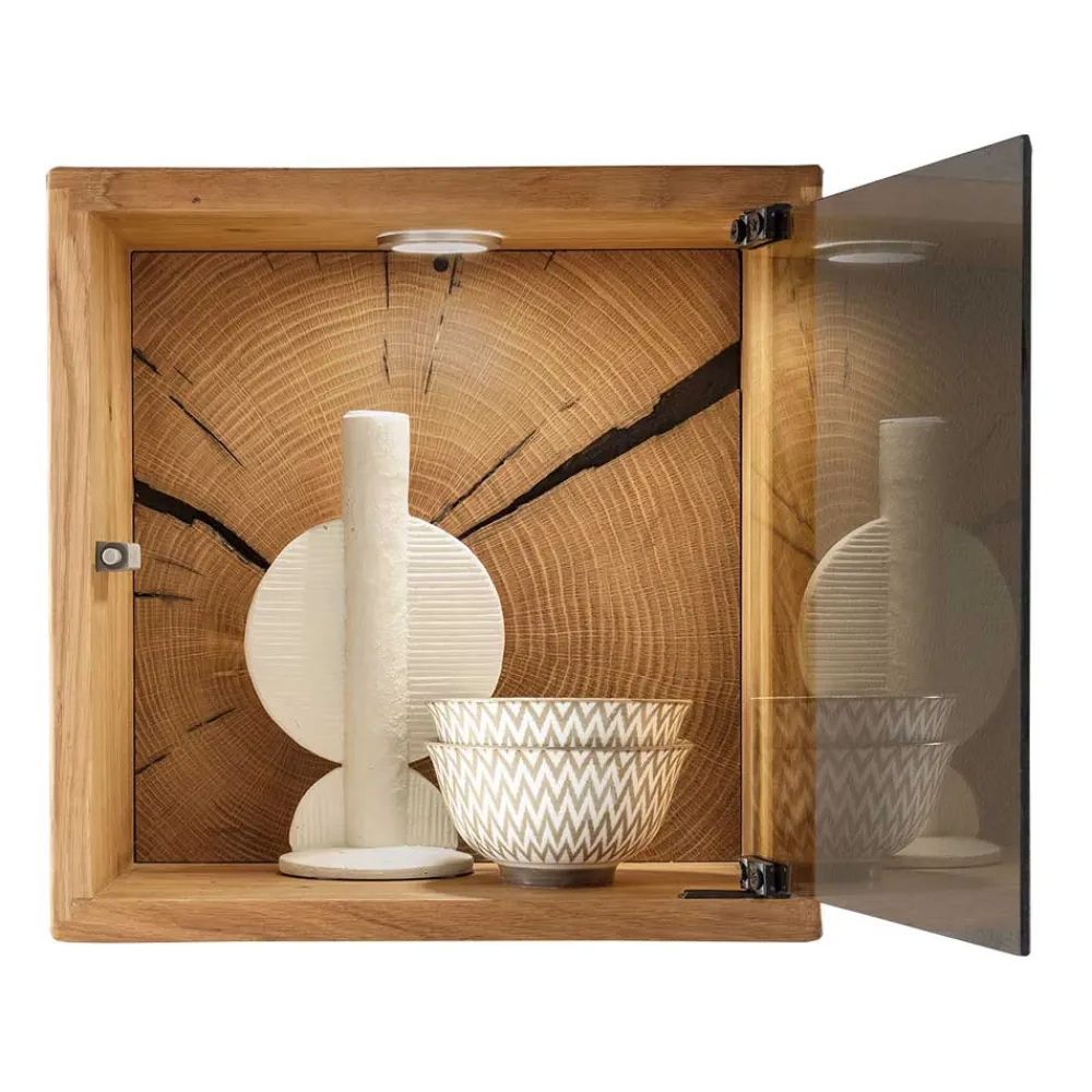 - Aus Wildeiche Massivholz und getöntem Glas gefertigt