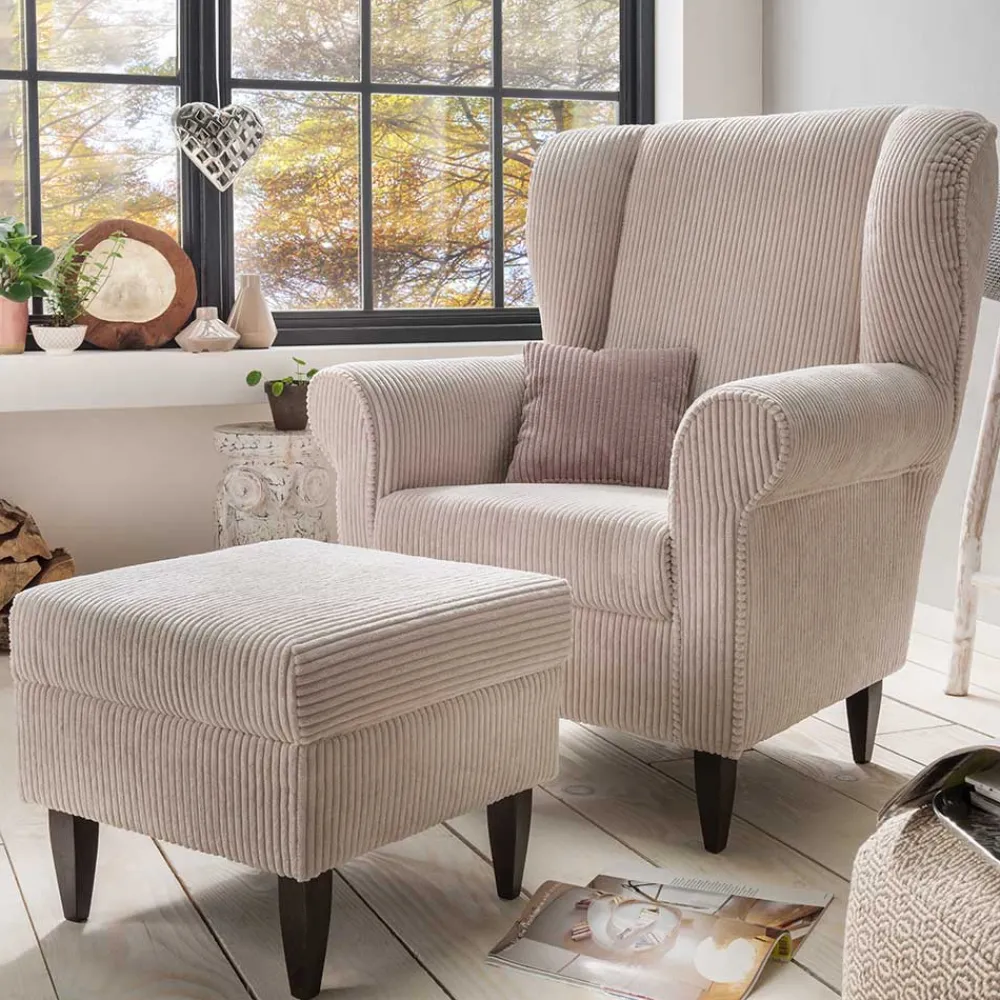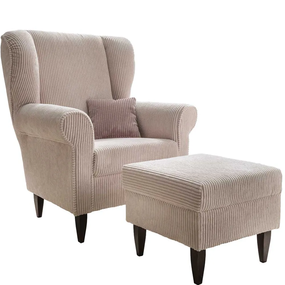 - Exzellenter Ohrensessel mit Hocker in Beige und Wengefarben