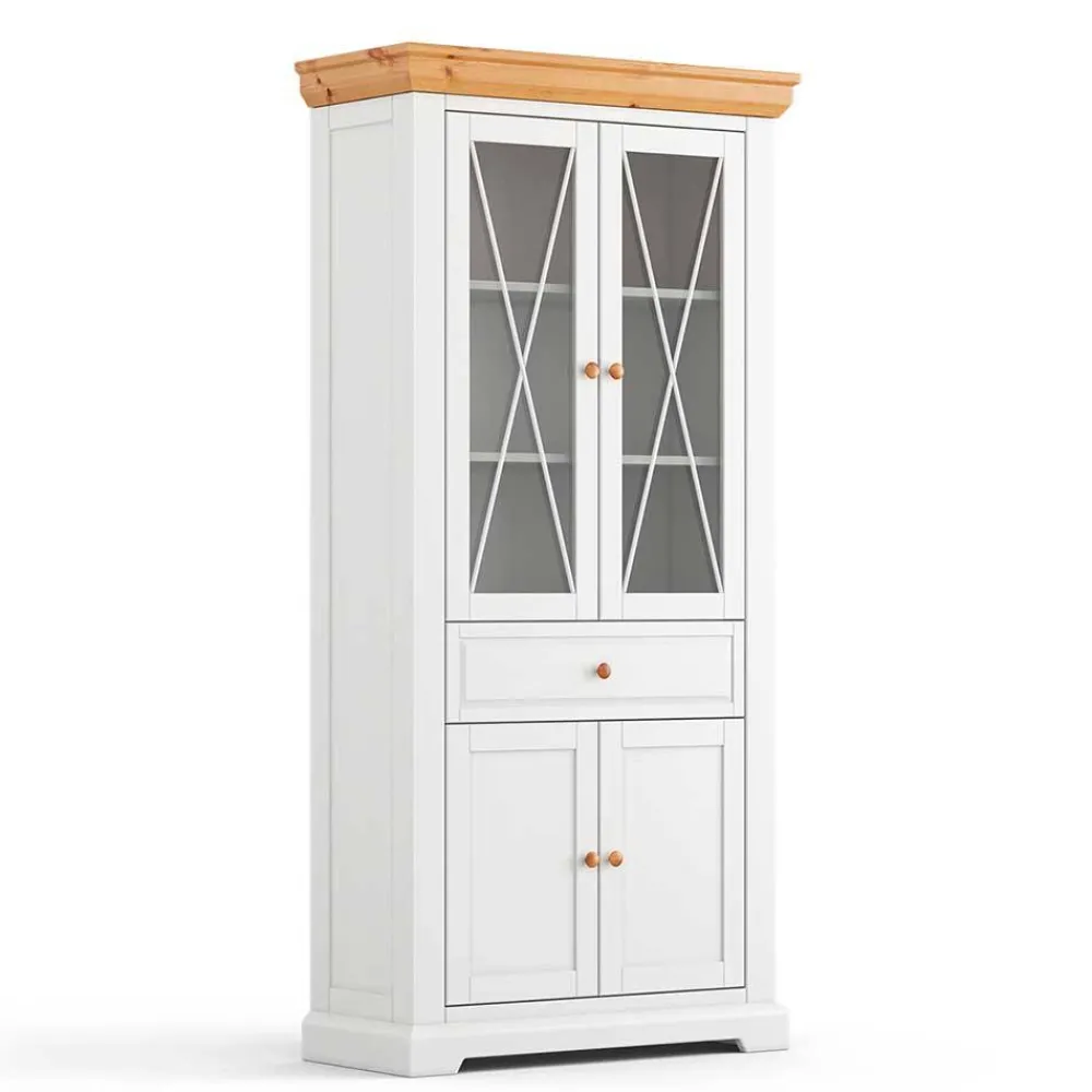 - Oberflächen weiß lackiert mit 85 % Deckkraft, Maserung leicht durchscheinend, RAL 9003, kieferfarbene Elemente gebeizt und lackiert