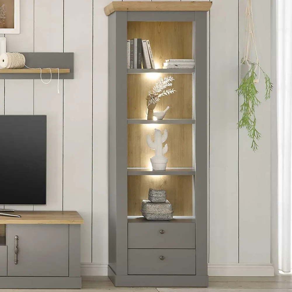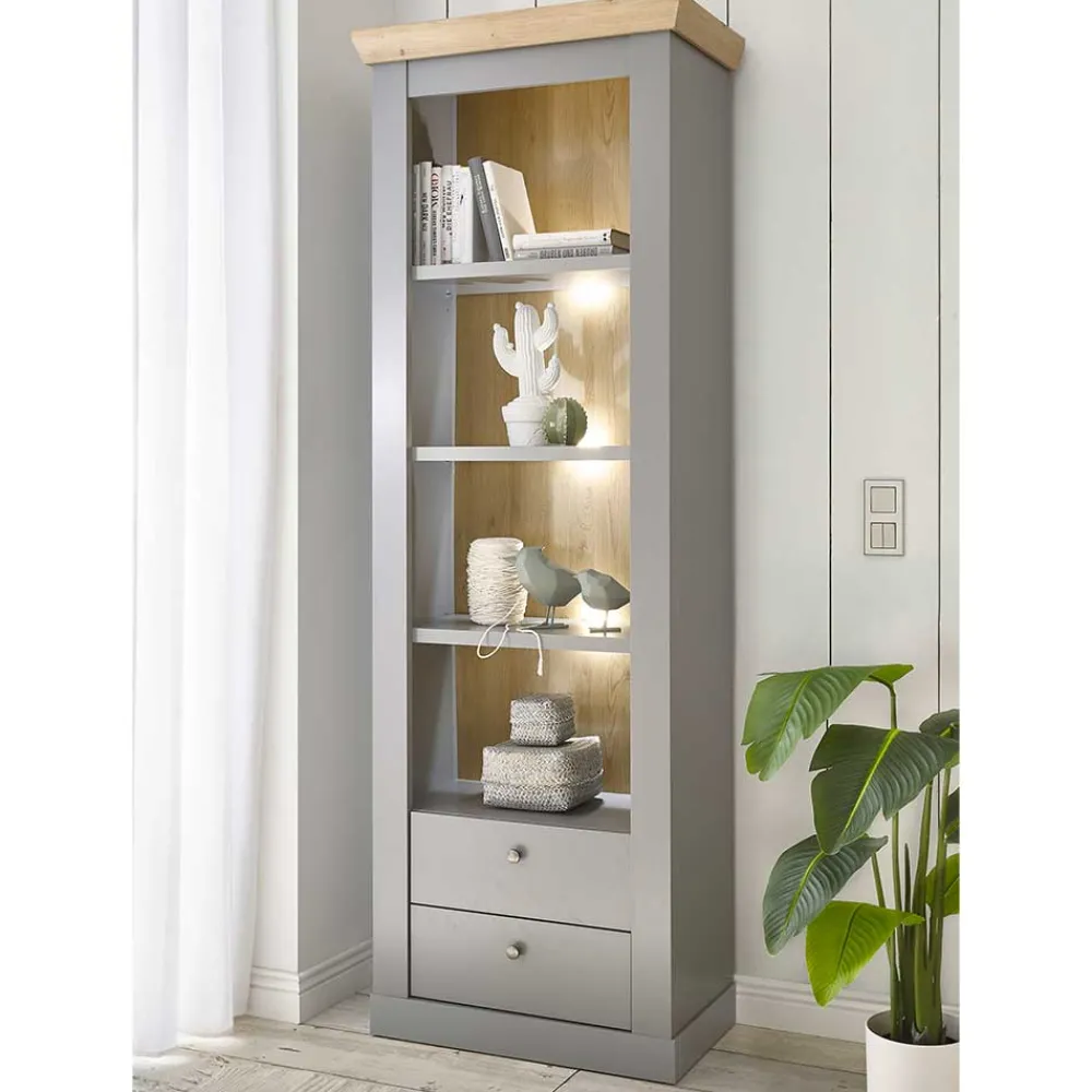 - Trendstarkes Stauraumregal in Lichtgrau und Eichefarben