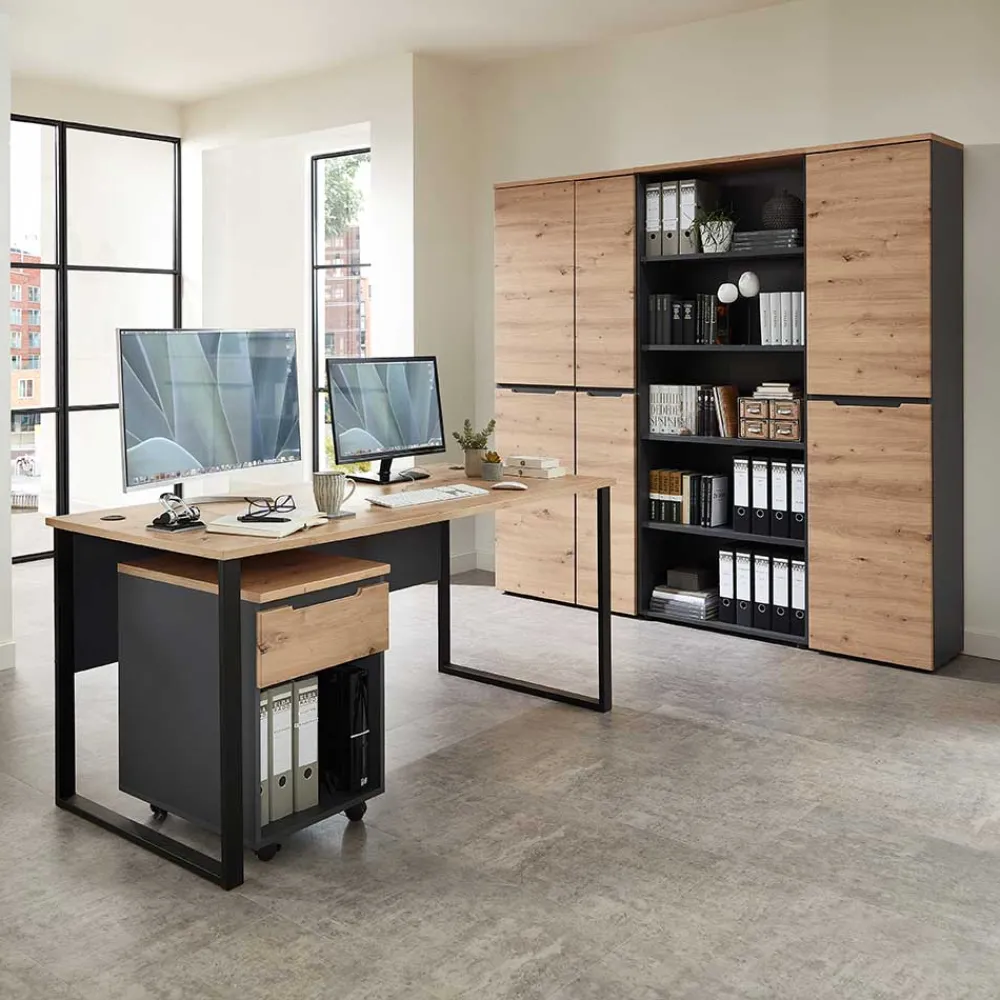 - Kontraststarke Büromöbel in Wildeichefarben, Dunkelgrau und Schwarz