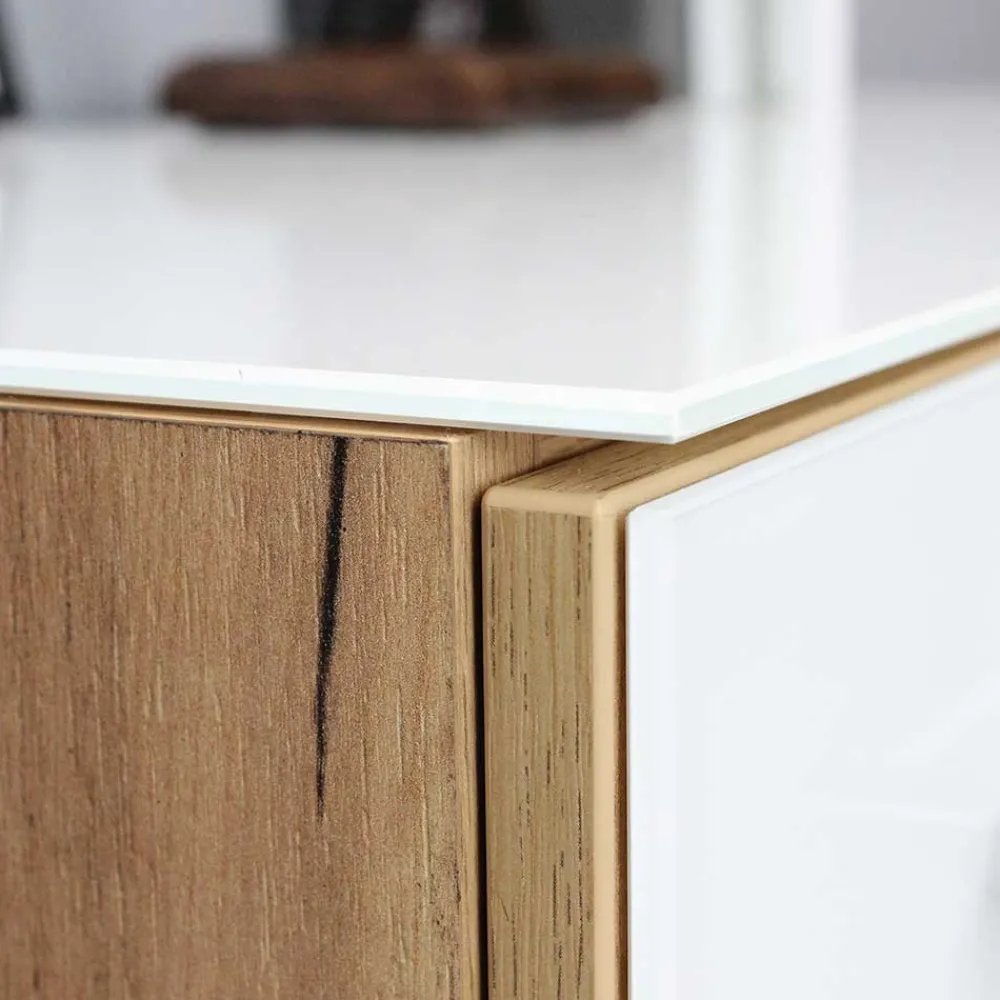 - Melaminbeschichtete Oberfläche in Weiß und in Holzoptik Wildeiche, Türen und Oberplatten zusätzlich mit Sicherheitsglas beschichtet