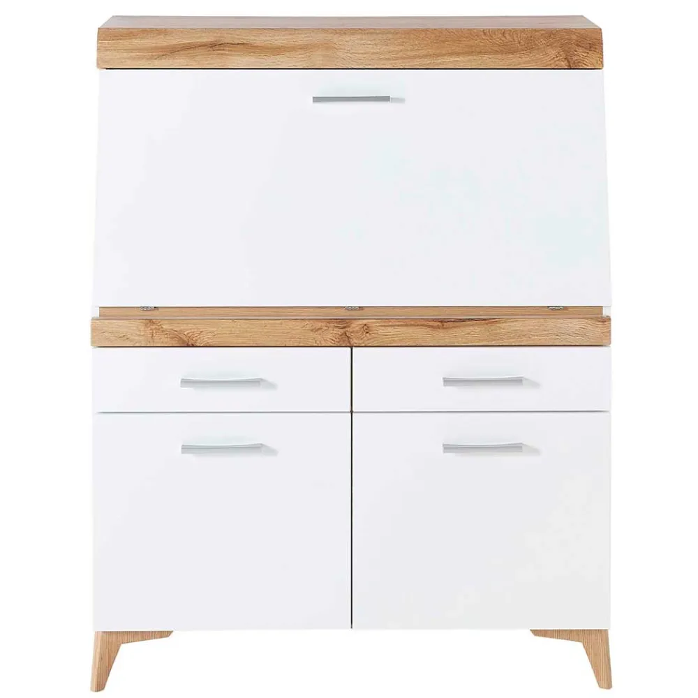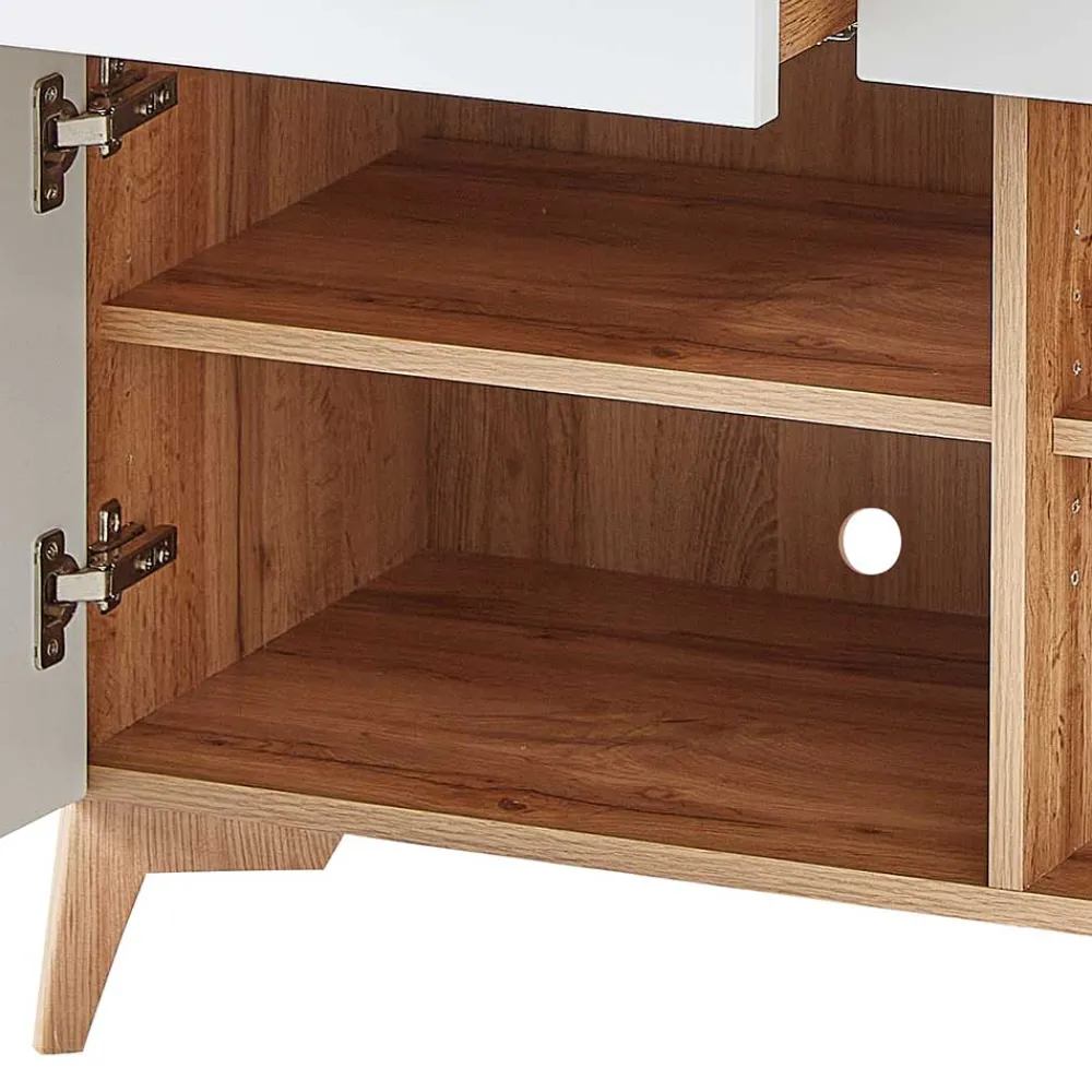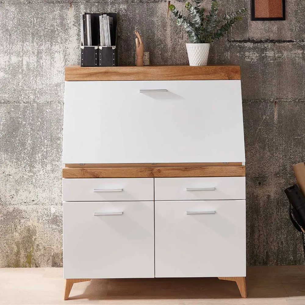 - Oberflächen weiß matt und in Holzoptik Alteiche foliert, Kanten an der Front tiefgezogen