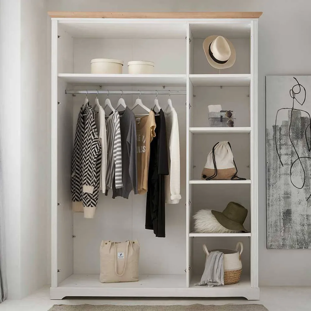 - Innen zwei Facheinheiten, links eine Kleiderstange und ein Einlegeboden, rechts vier Einlegeböden