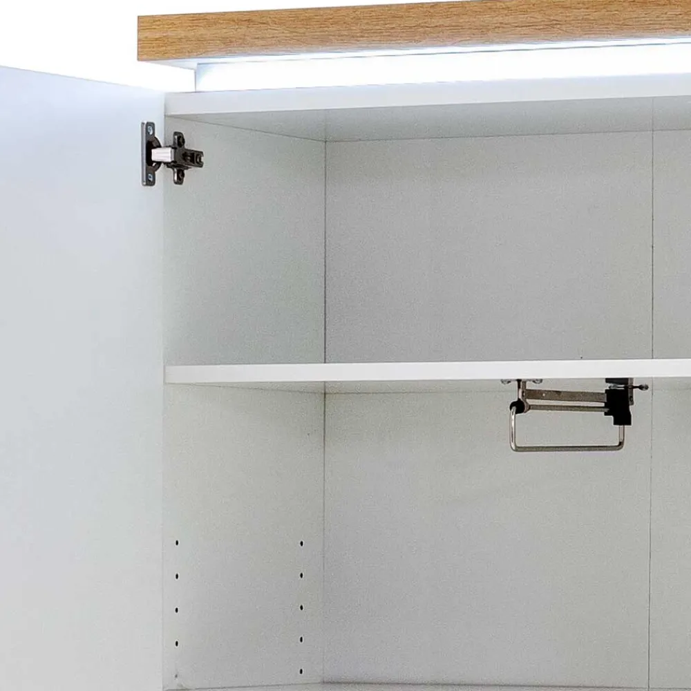 - Pflegeleicht melaminbeschichtete Oberfläche in Weiß, Absetzung in Holzoptik