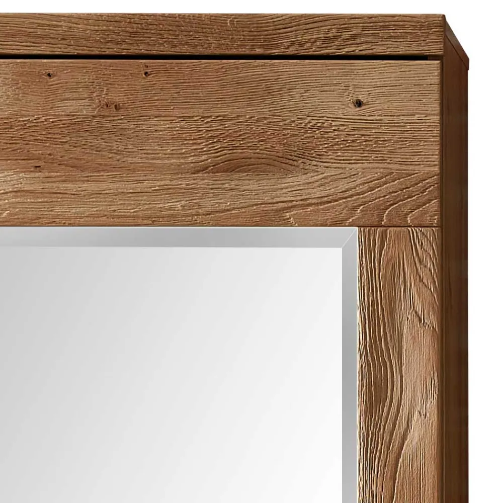 - Hergestellt aus Spiegelglas, Wildeiche Massivholz (Front) und Spanplatte (Korpus)