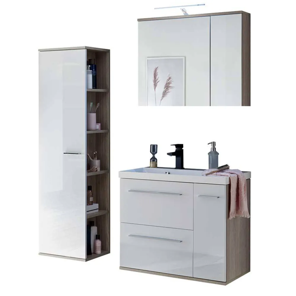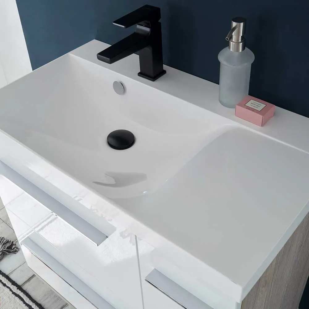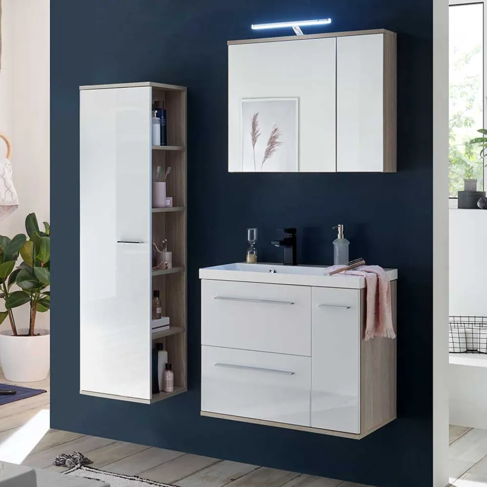 - Harmonische Badmöbel in Weiß und Eichefarben
