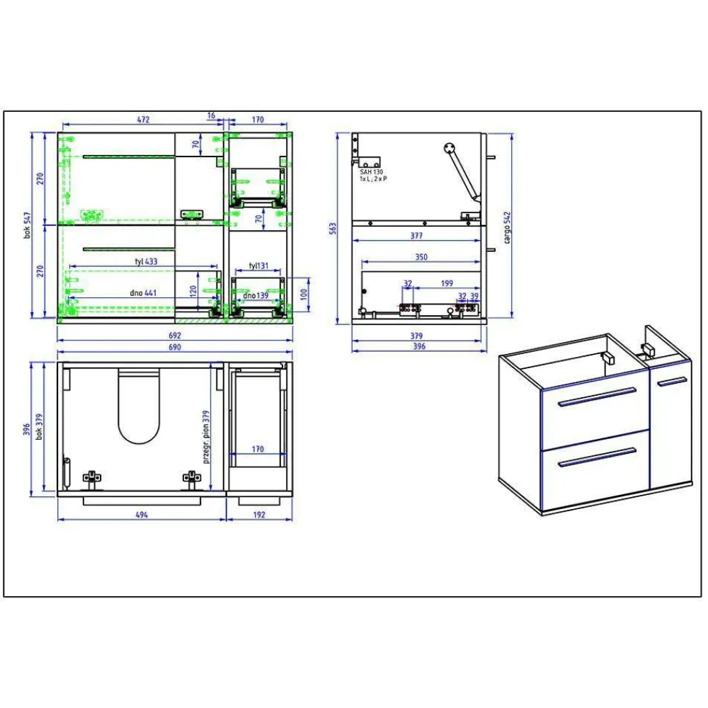 - Links eine Stauraumklappe und ein Schubkasten mit Metallauszug