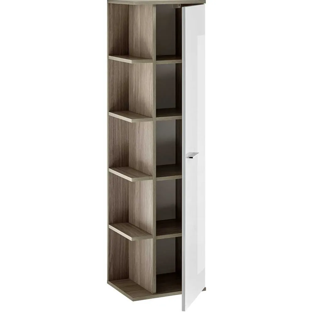 - Seitlich ein offenes Regal mit vier Ablagen