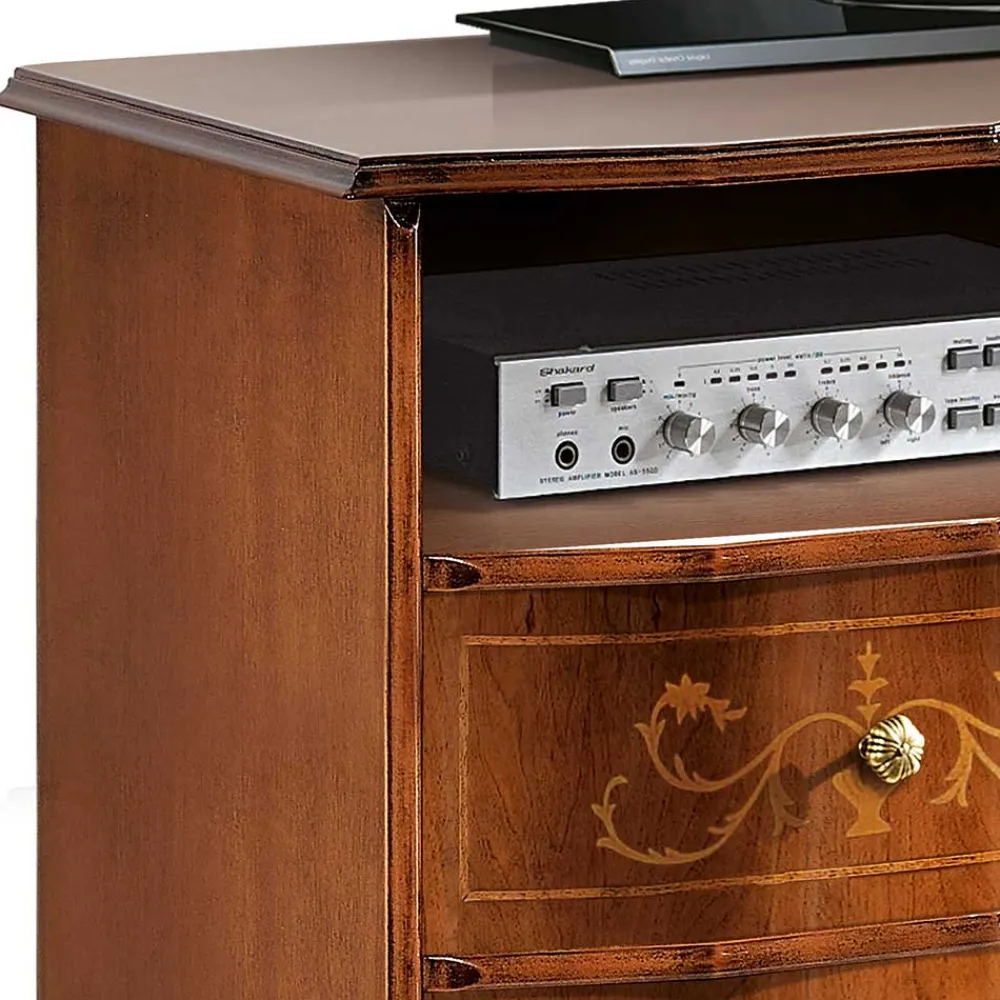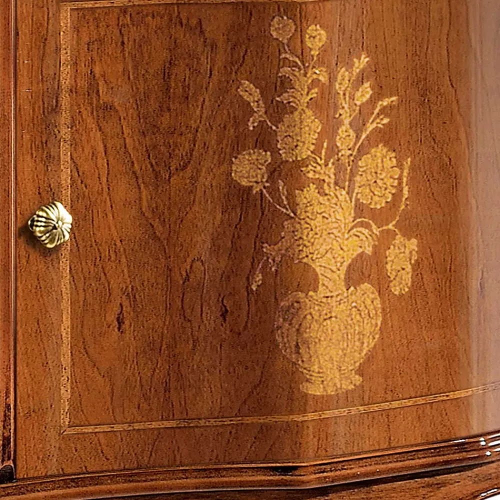 - Holzoberfläche lackiert, MDF mit Nussbaumholz furniert, Intarsien aus Pappelholz, gesamt lackiert