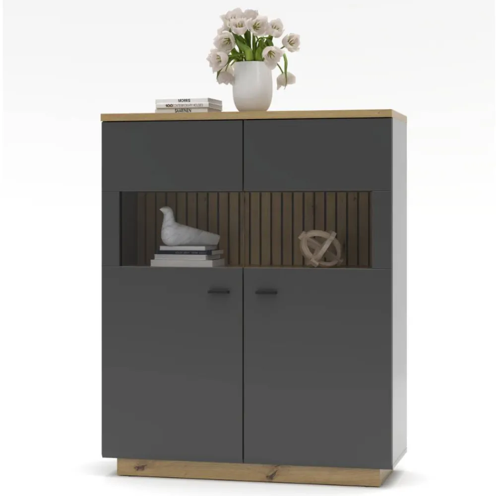- Ansprechende Highboard Vitrine in Dunkelgrau matt und Wildeichefarben