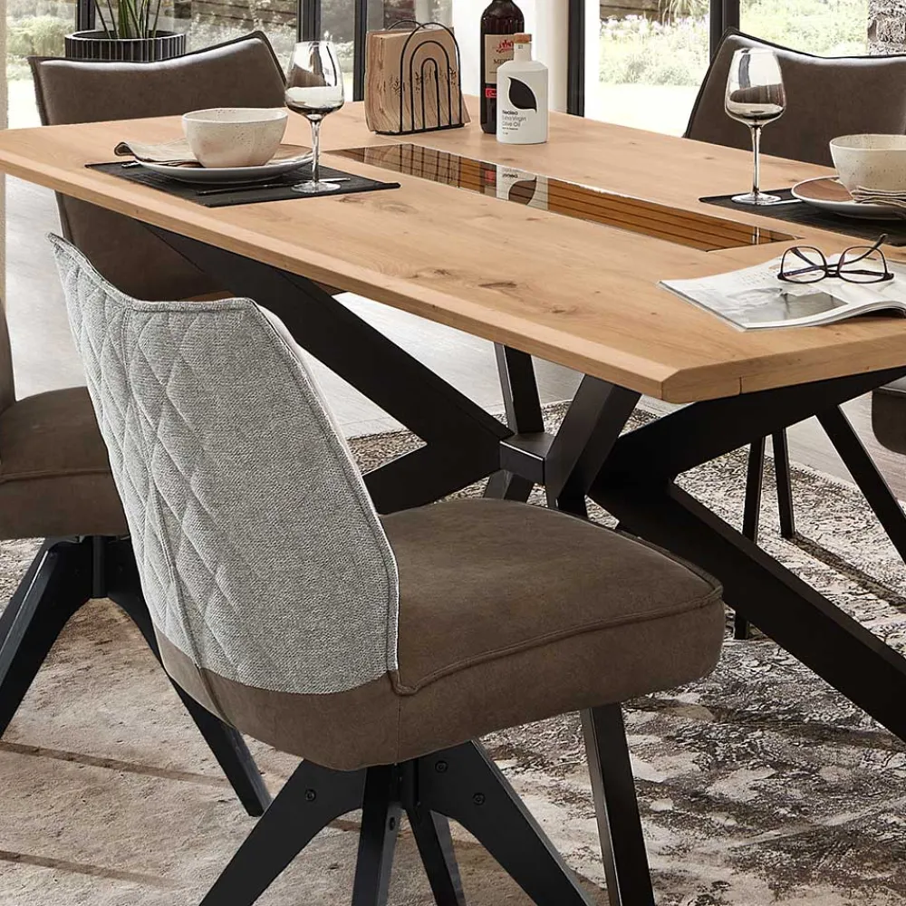 - Tischplatte aus MDF mit einer Stärke von ca. 1,8 cm, in Holzoptik Wildeiche melaminbeschichtet, mittig eine Absetzung in Paneeloptik mit Glasauflage, am Rand aufgedoppelt