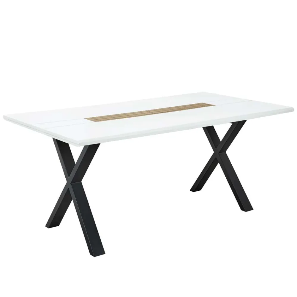 - Tischplatte aus MDF mit einer Stärke von ca. 1,8 cm, am Rand aufgedoppel, weiß melaminbeschichtet, mittig eine Absetzung in Paneeloptik mit Glasauflage