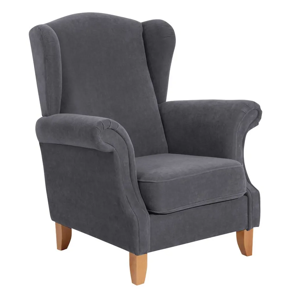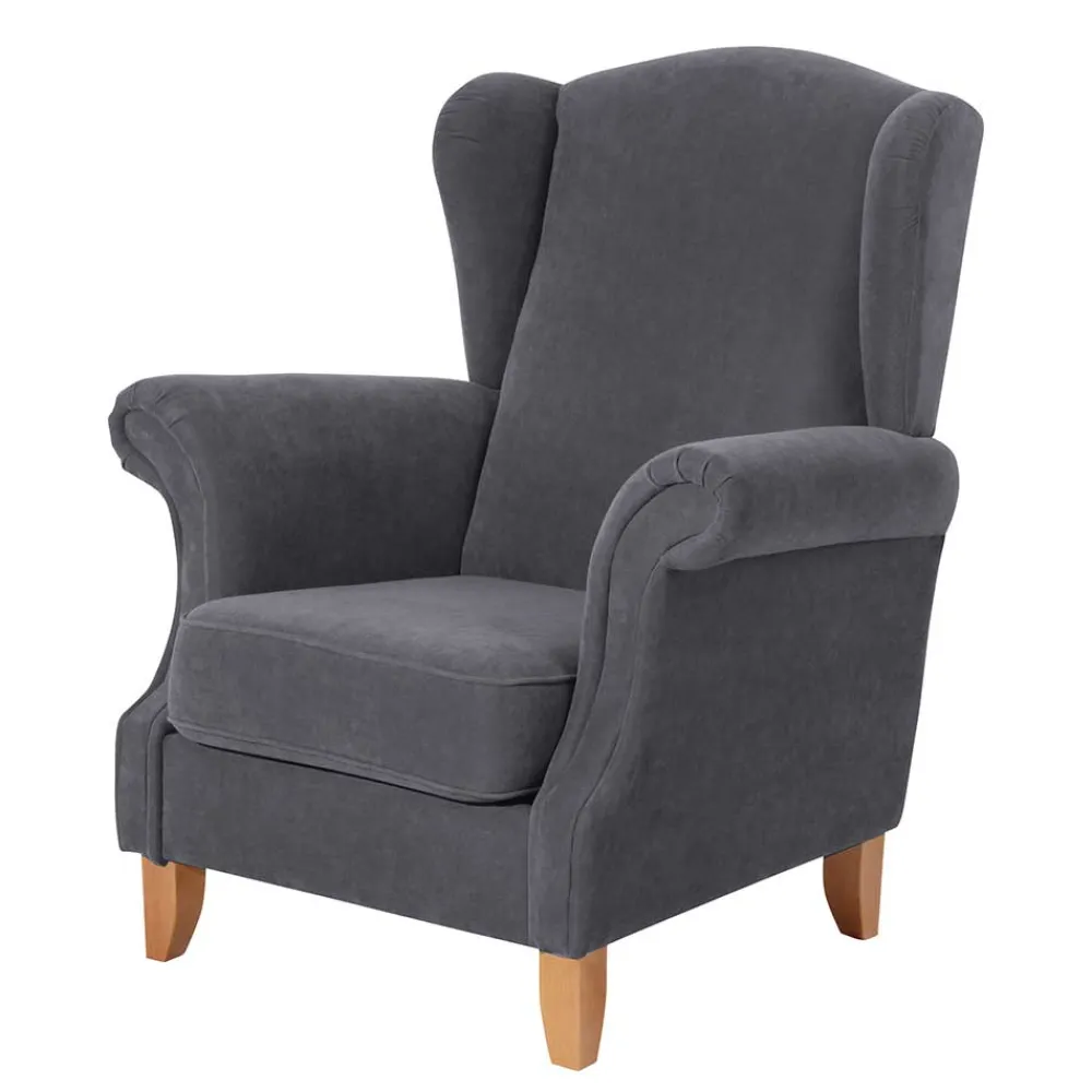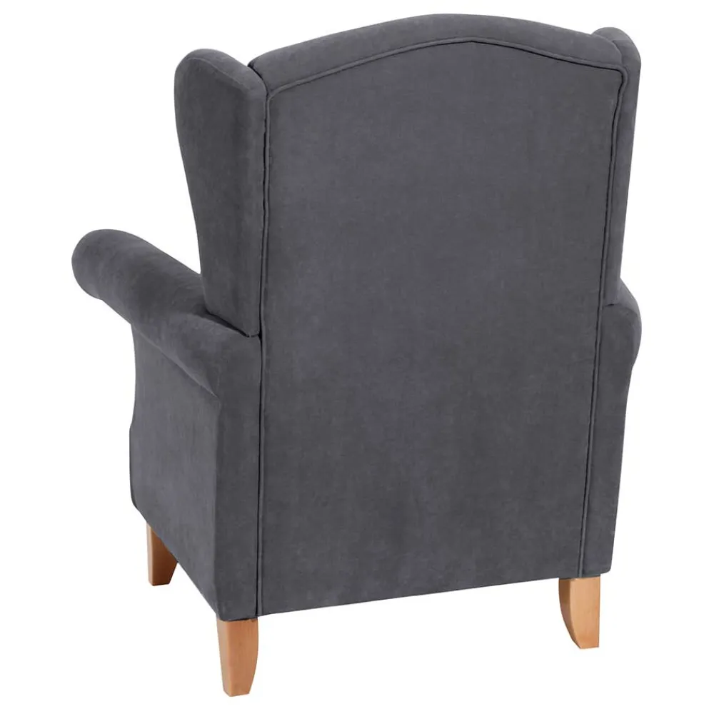 - Der Sessel kombiniert gedeckte Anthrazit- mit warmen Buchefarbtönen