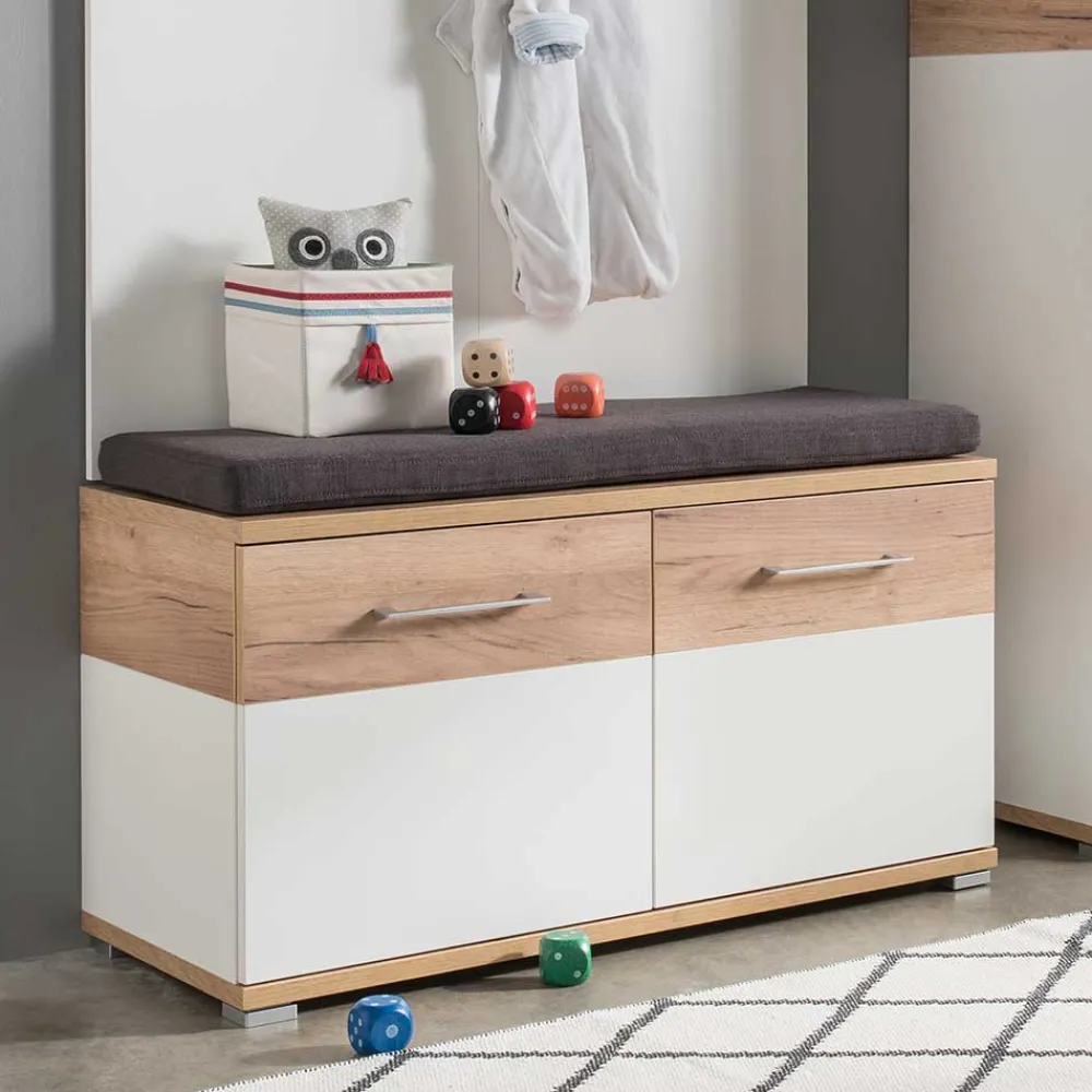 - Bestehend aus einer Schuhbank mit Sitzkissen, einem Garderobenpaneel und einem Garderobenschrank