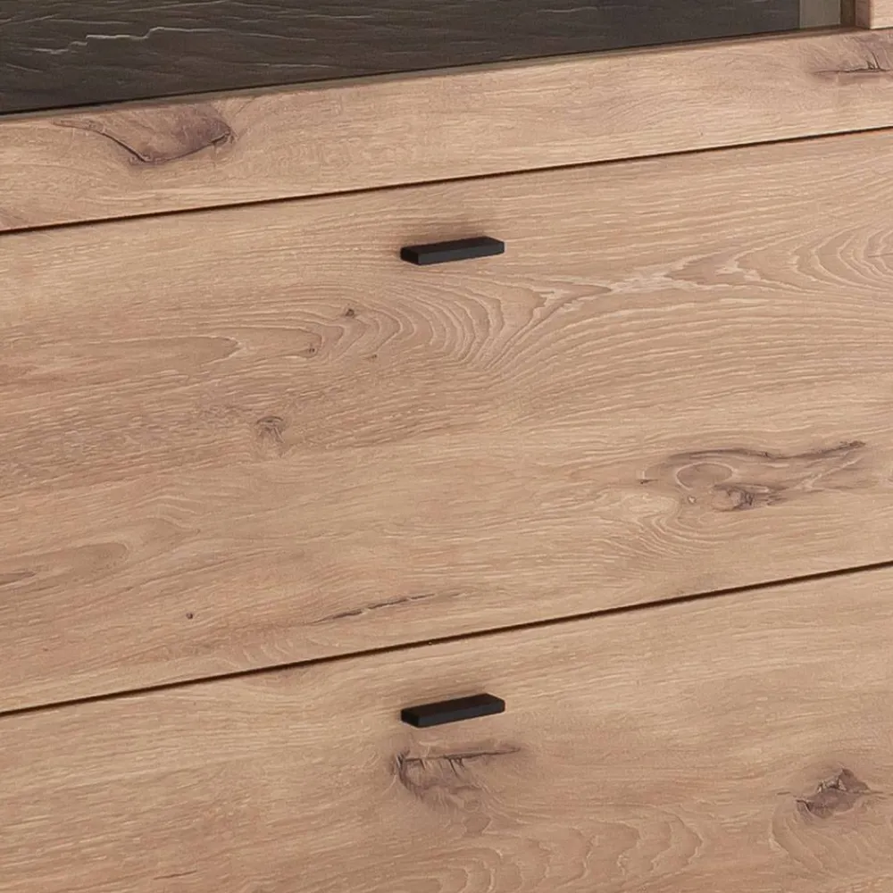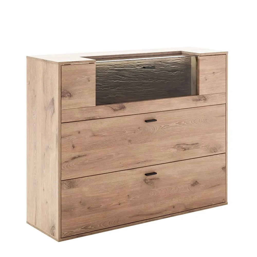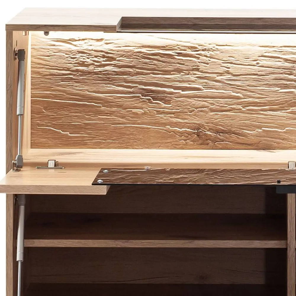 - HDF Rückwand innen in Holzoptik foliert, zusätzlich in 3D Holzoptik sandgestrahlt beschichtet