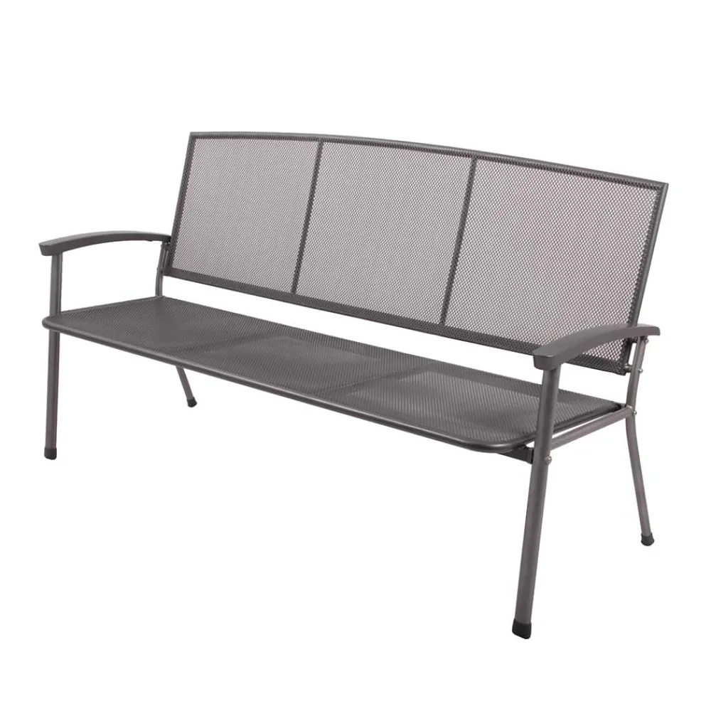 - Stabile Rückenlehne und Sitz aus Streckmetall, oberer Holm in leichtem Bogen, Lehne ist durch Längsstreben in die drei Teile unterteilt
