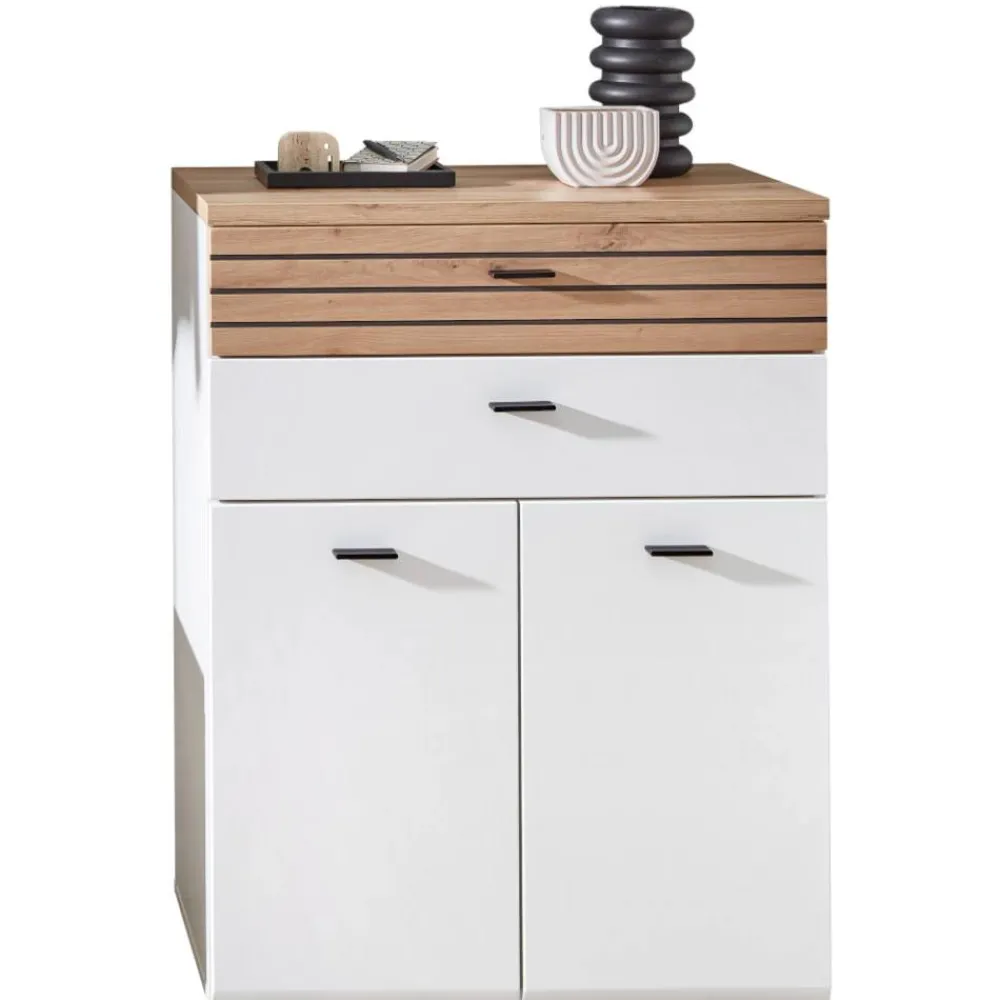- Oberflächen Korpus weiß melaminbeschichtet, Front in Weiß matt und in Wildeiche Holzoptik foliert