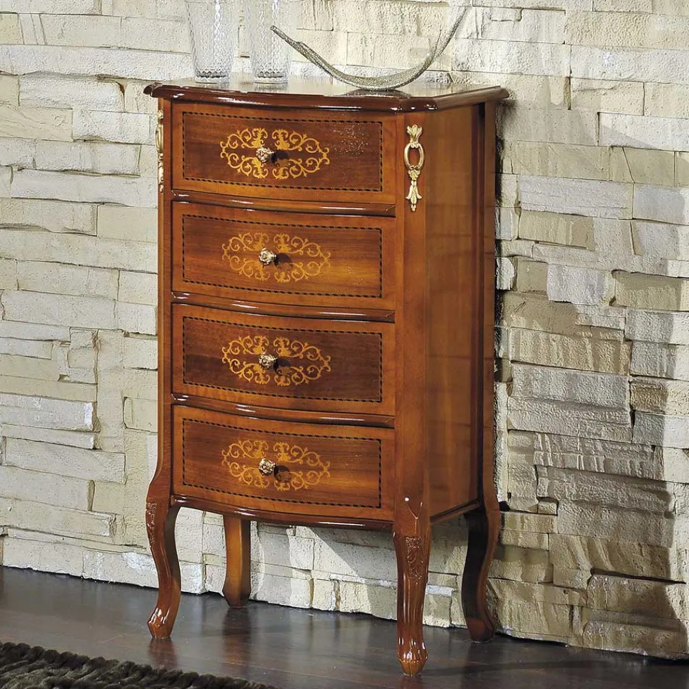 - Vier Schubkästen auf traditionellem Holzauszug mit dezent gerundeter Front und wertvollen Intarsien