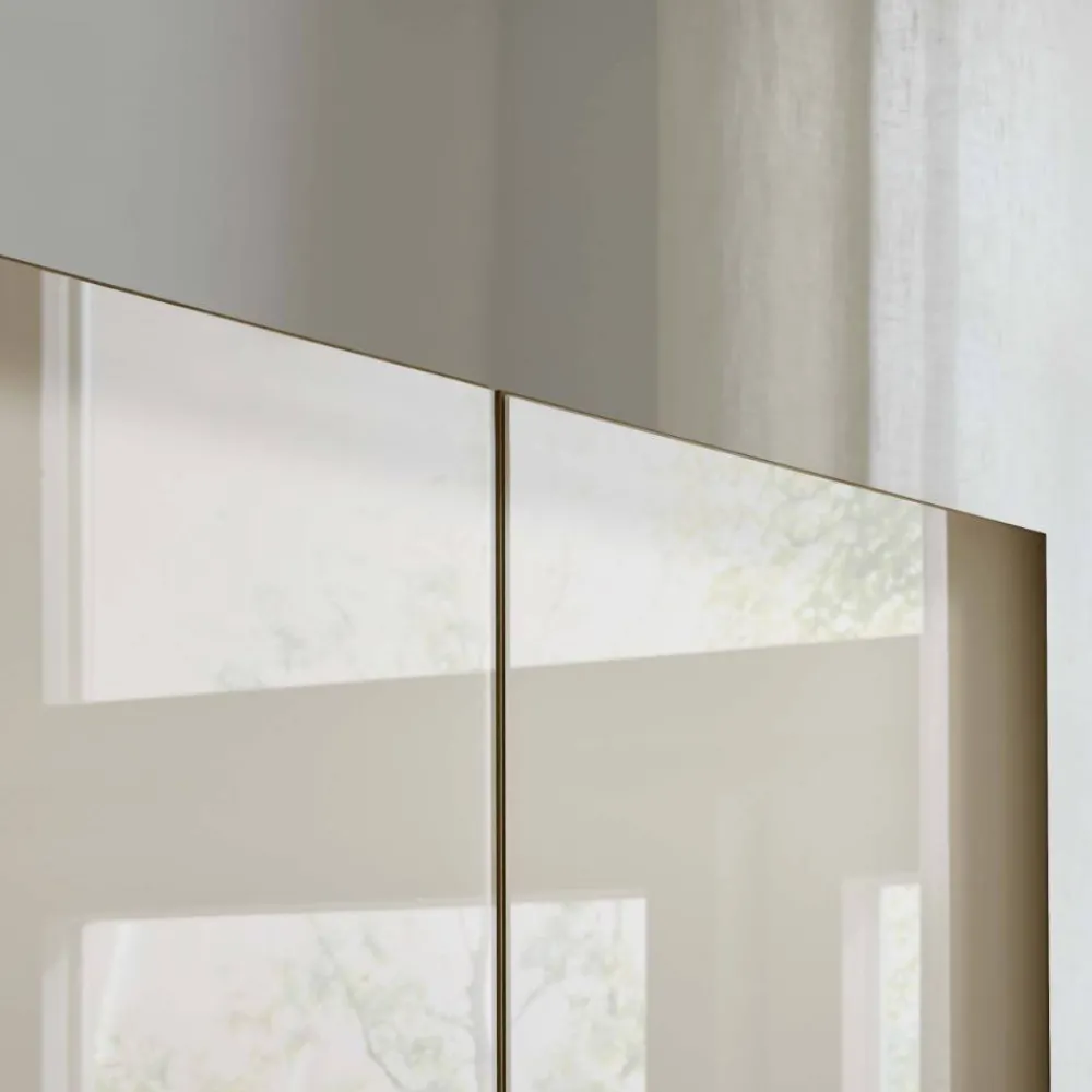 - Vier Türen mit Soft Close Funktion, Holzwerkstoff mit Glasbeschichtung in Champagnerfarben, Bauchbinden Massivholz