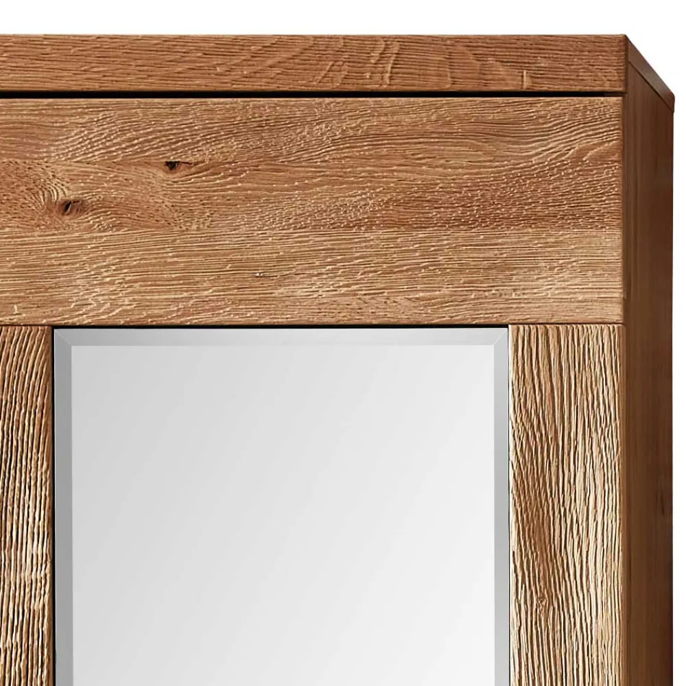 - Gefertigt aus Spiegelglas, Wildeiche Massivholz (Front) und Spanplatte (Korpus)