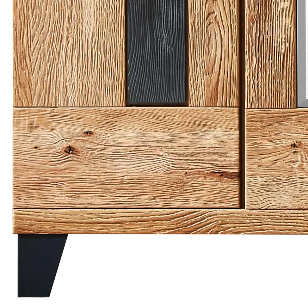 - Massivholz geschroppt und lackiert, Absetzung in Dunkelgrau, durchgehende Lamellen, Spanplatte foliert in Holzoptik, Metall pulverbeschichtet in Anthrazit