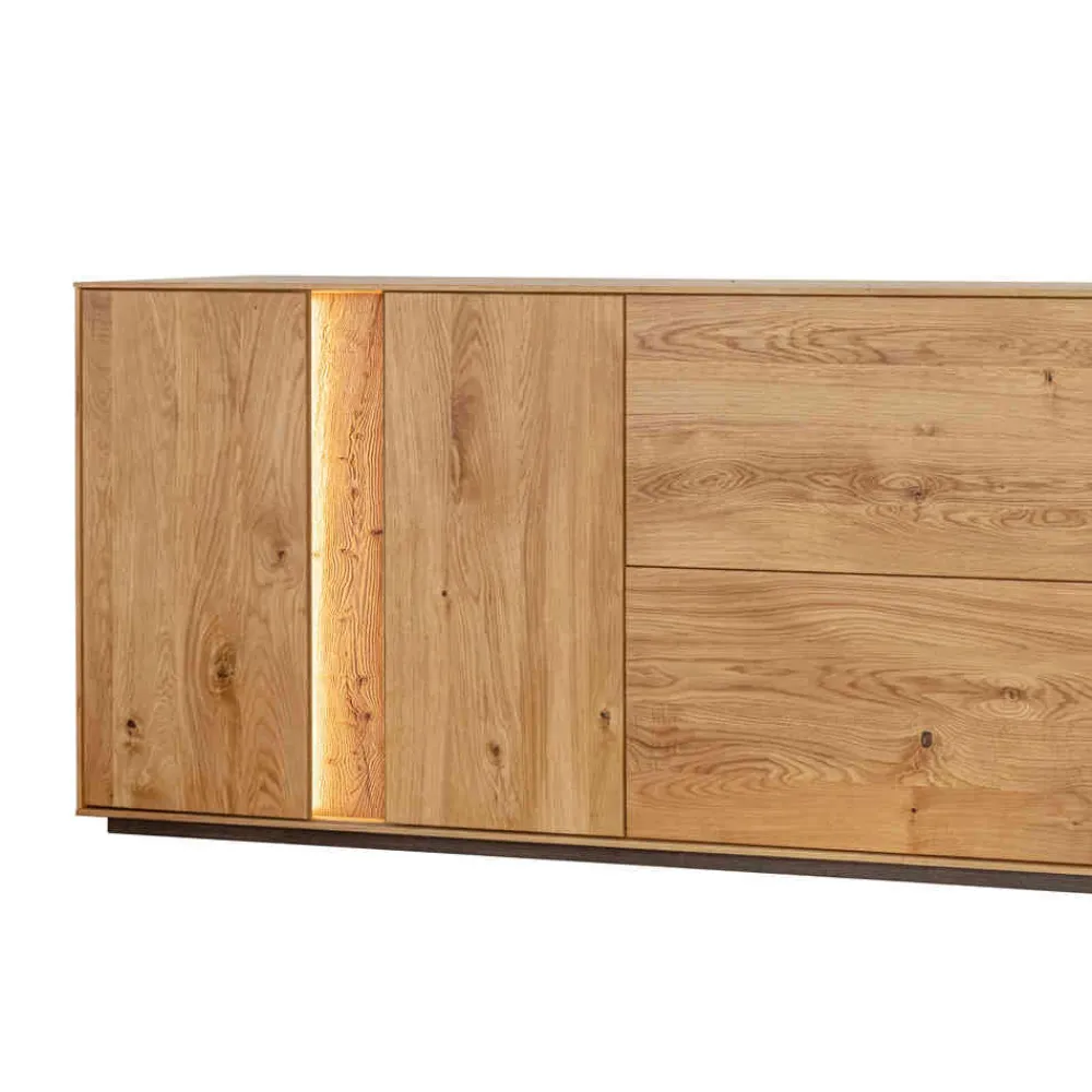 - Die LED-Beleuchtung betont die raue Holzstruktur der Blende zwischen den Türen