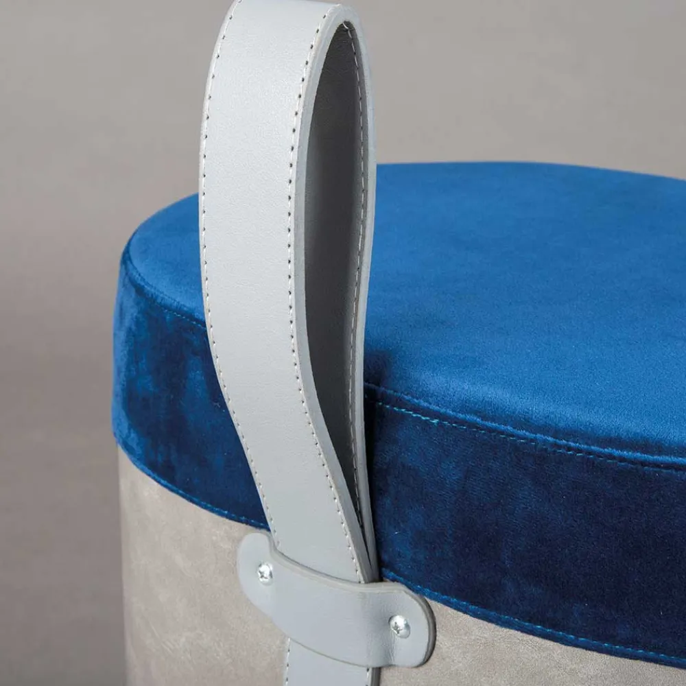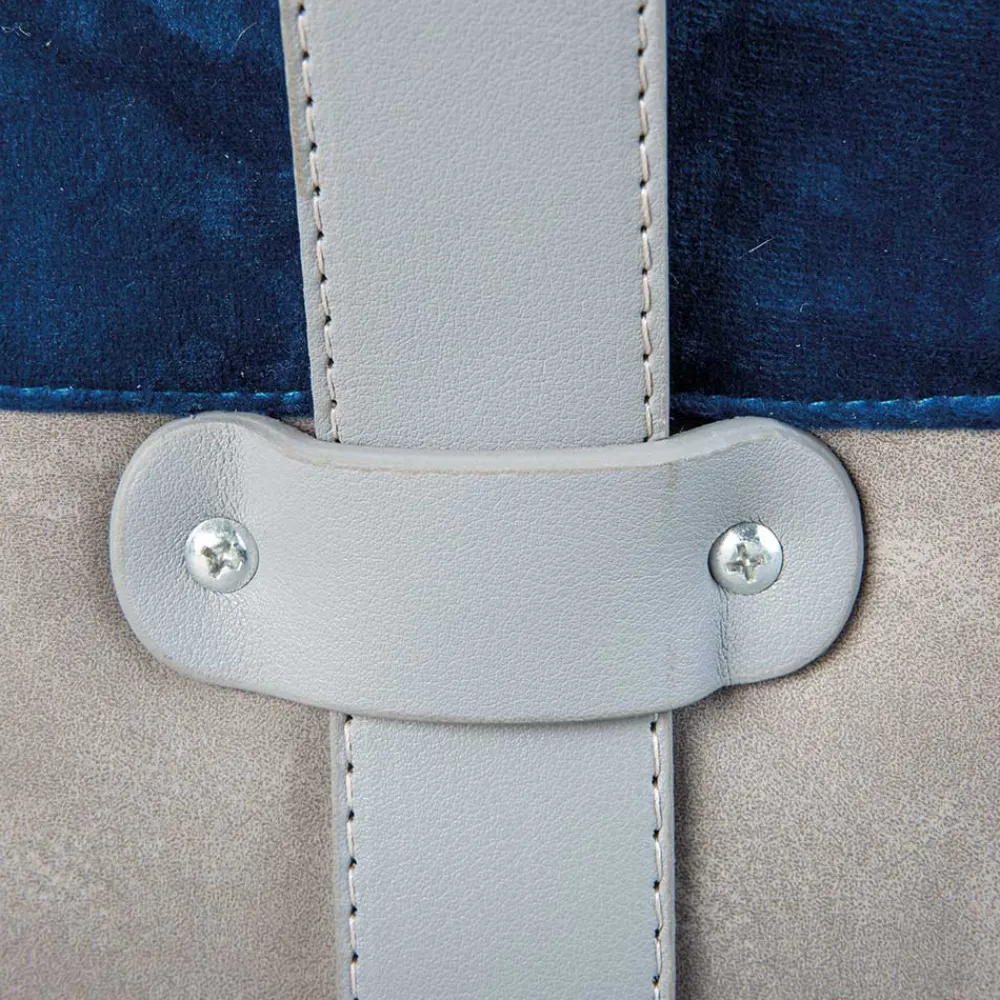 - Bezug aus weichem Samt (100 % Polyester) in Blau und Kunstleder (100 % Polyurethan) in Hellgrau