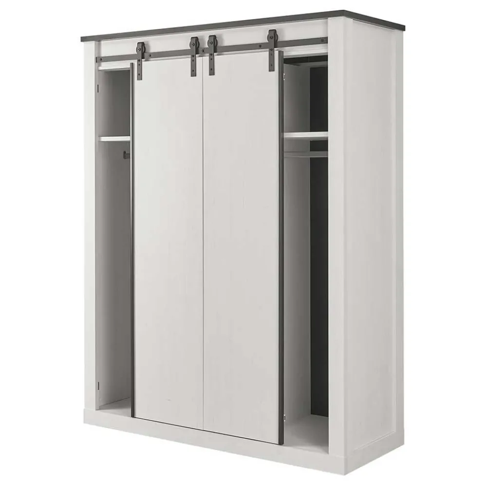 - Außen je ein Einlegeboden und eine Kunststoff-Kleiderstange, in der Mitte zwei Einlegeböden