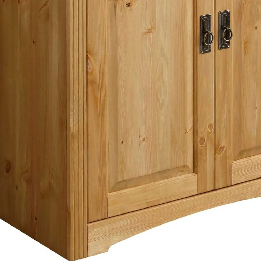 - Zwei Drehtüren an stabilen Metallscharnieren, innen befinden sich zwei Einlegeböden