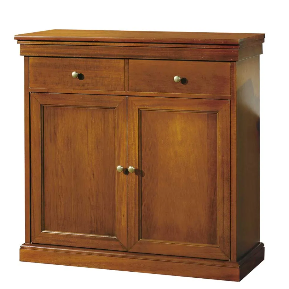 - Aus Tulpenbaum Massivholz (Rahmen und Gestell), Pappelholz (Schubladen) und MDF (Seiten, Deckplatte, Füllungen) gefertigt