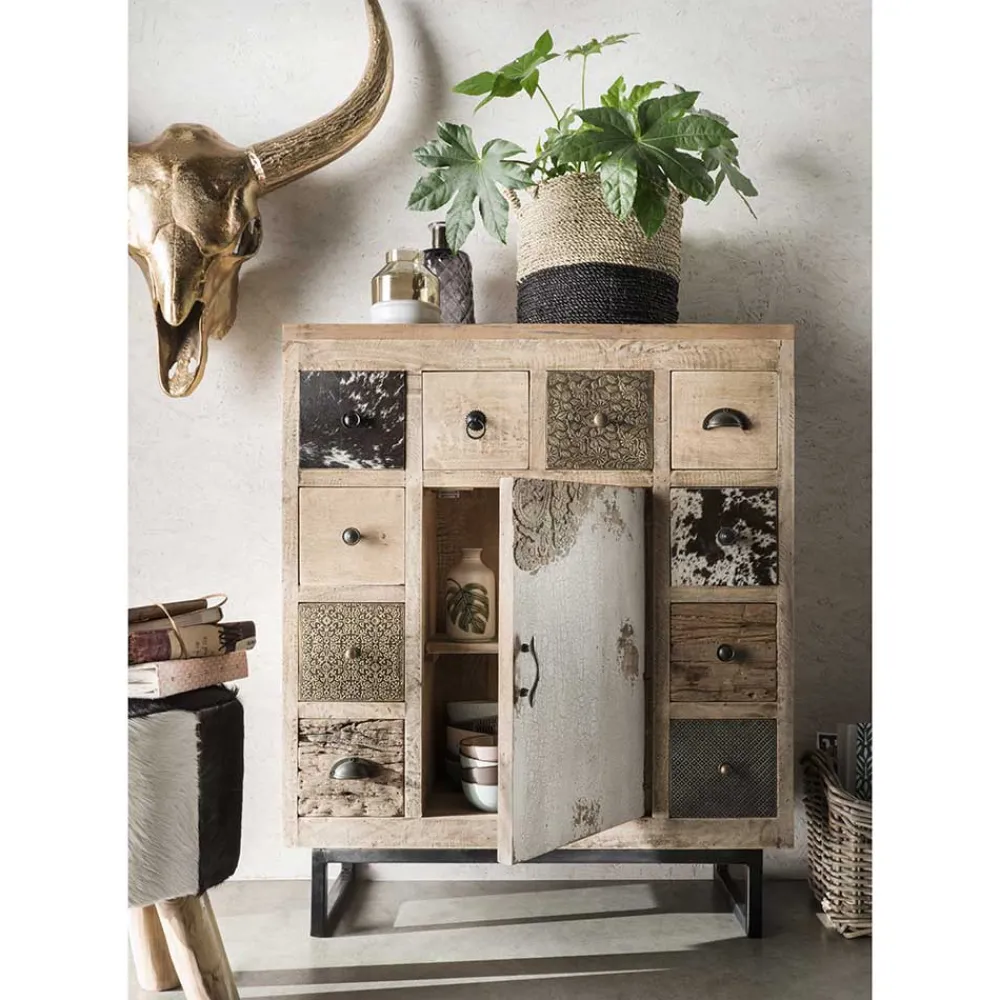 - Holzoberfläche mit White Wash Effekt behandelt, Metall in Schwarz lackiert, Fronten teils mit echtem Ziegenfell und messingfarbigem Metall verziert