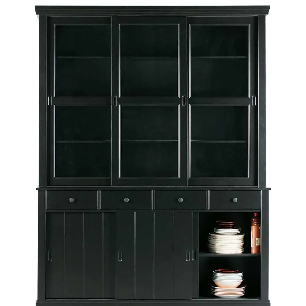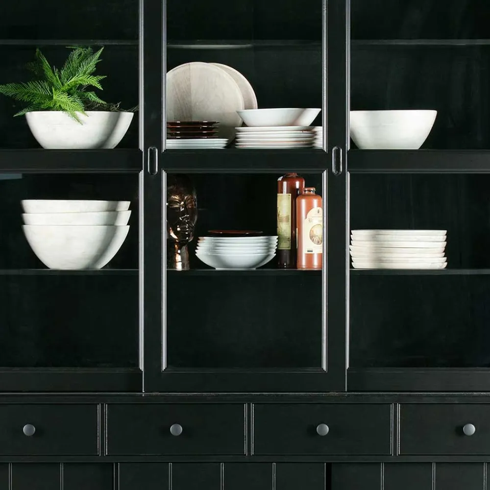 - Oben drei Glas-, unten drei Holzschiebetüren (auf Kunststoffschienen)