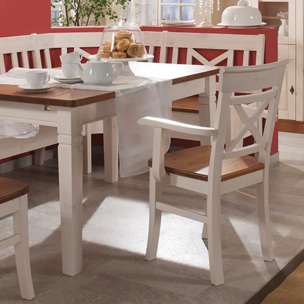 - Set bestehend aus Eckbank (2 Bankelemente, eine Armlehne links und Ecke), Tisch, Armlehnenstuhl und Stuhl ohne Armlehnen
