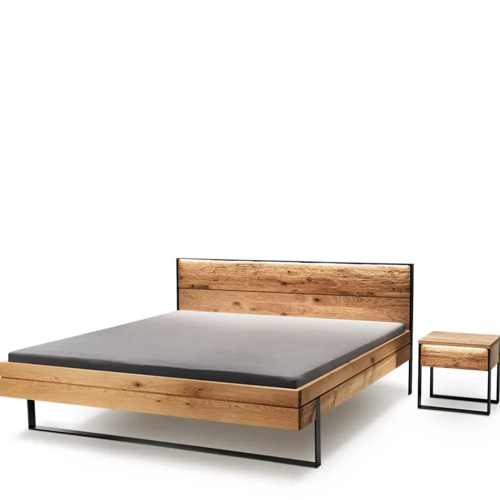 - Markantes Kopfteil mit Metallrahmen und grob sandgestrahltem Holz