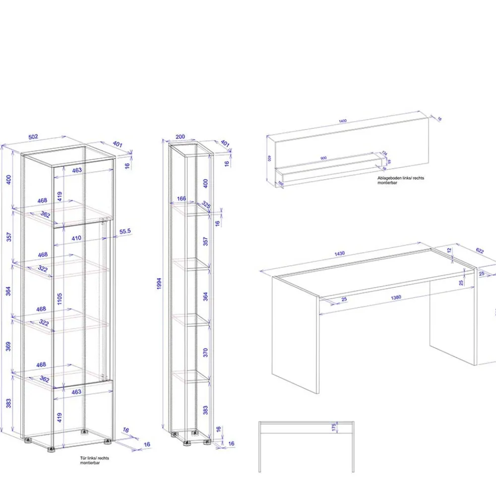 - Wandmontage sowie Wangengestell und flache Kunststoffgleiter, zusätzliche Kippsicherung an der Wand bei den Korpusmöbeln erforderlich