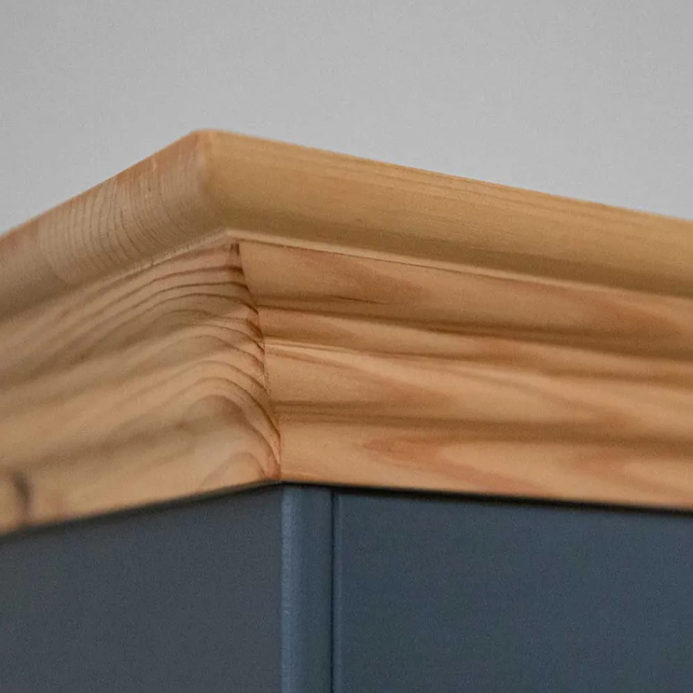 - Oberflächen grau lackiert (RAL7012), Deckplatte in Kieferfarben