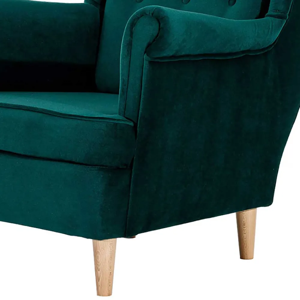 - Hohe, leicht nach hinten geneigte Rückenlehne mit dekorativen Zierknöpfen