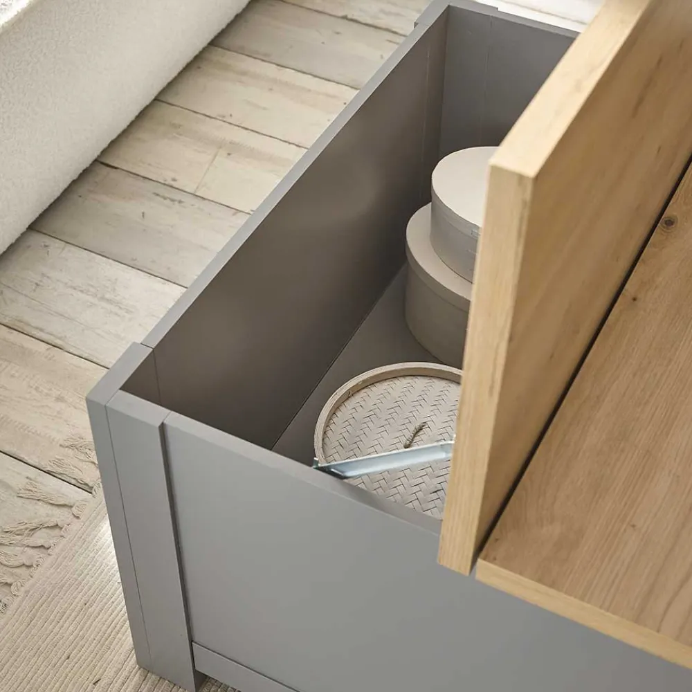 - Absolut pflegeleichte Oberflächen, melaminbeschichtet in Lichtgrau, Tischplatte in Holzoptik Eiche