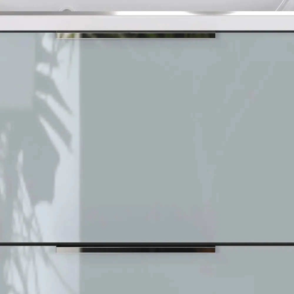 - Oberflächen in Dunkelgrau melaminbeschichtet, Front mit Glas in Silbergrau beschichtet