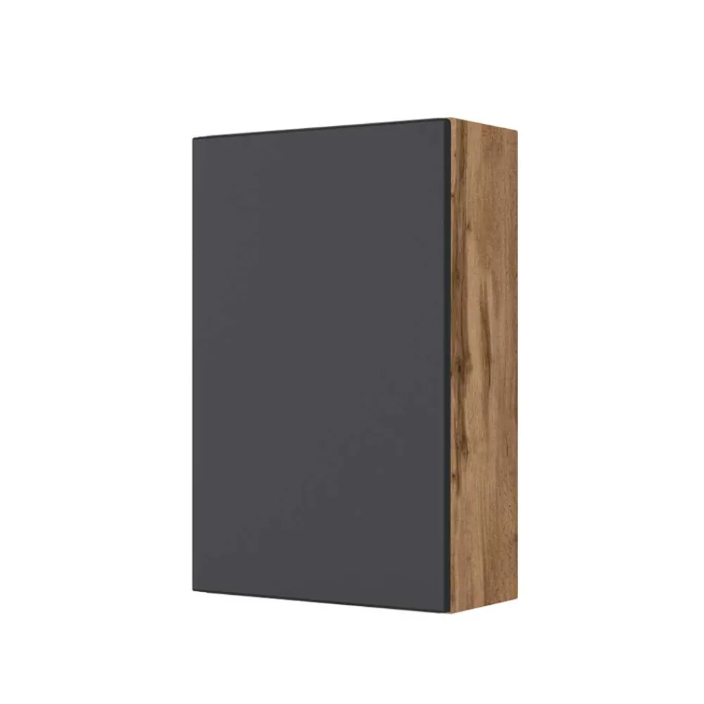 - Korpus sorgfältig melaminbeschichtet in Holzoptik Wildeiche, Front foliert in Dunkelgrau, Rückwand in Weiß